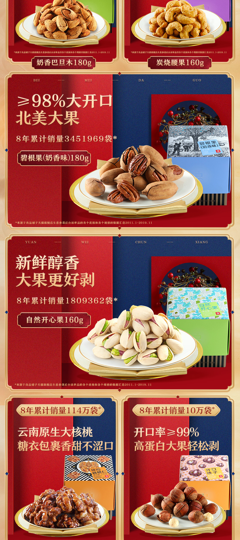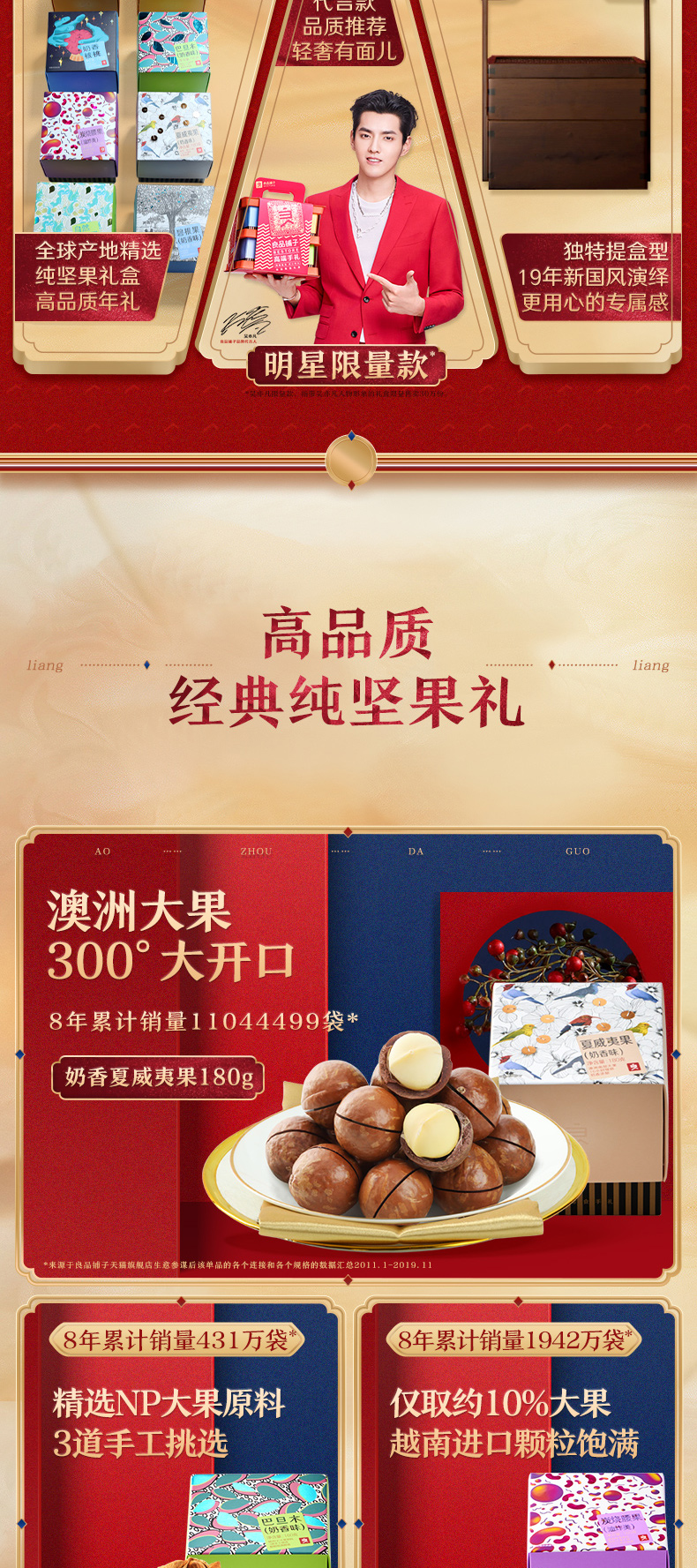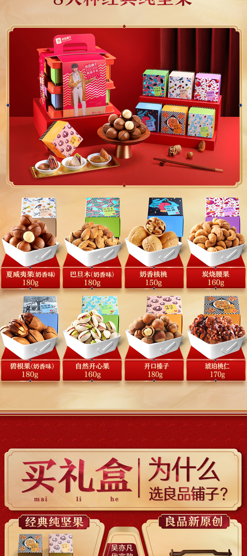 礼盒含有8款经典纯坚果,经过3到手工筛选,精选10%大果,开口率99%,大果更好剥。包含:夏威夷果奶香味 180g、巴旦木奶香味 180g、核桃奶香味 150g、炭烧腰果 160g、碧根果 奶香味 180g、自然开心果 160g、开口榛子 180g、琥珀桃仁 170g