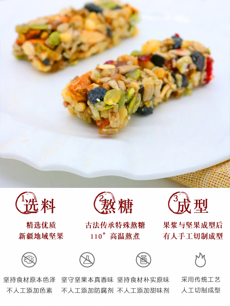 这款切糕的制作,首先把刚新鲜采摘含糖量达30%的甘甜葡萄榨汁,在115摄氏度下熬煮4小时,把90公斤葡萄汁浓缩成30公斤糖浆;然后将核桃仁、玉米饴、葡萄干、蔓越莓干等多种坚果放入,最后凝干成型分割好即可。