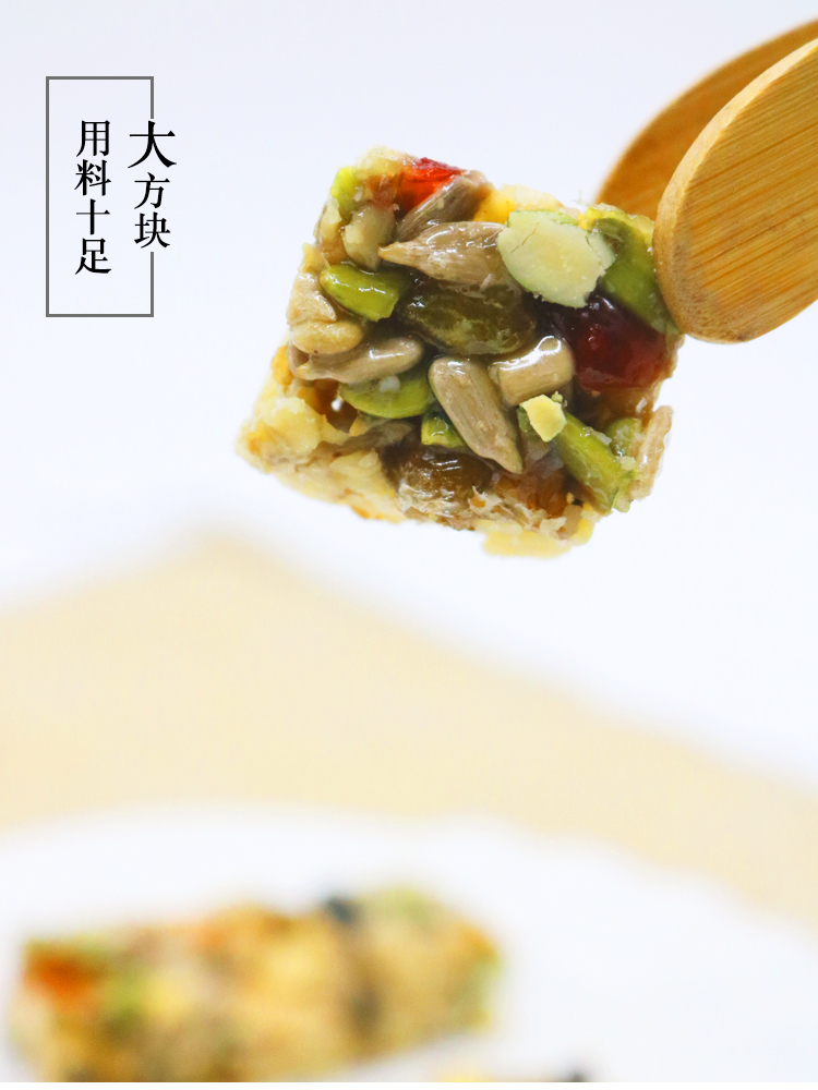 在制作过程中不添加人工色素、防腐剂、甜味剂,规整的小方形,独立小包装,规格是500g。因为切糕是人工做成的,不能做到完全的均匀,所以每一块切糕都是独一无二的。同时切糕中还富含人体所必需的各种营养成分,包括各种氨基酸和微量元素,除了好吃,还对人体有益。