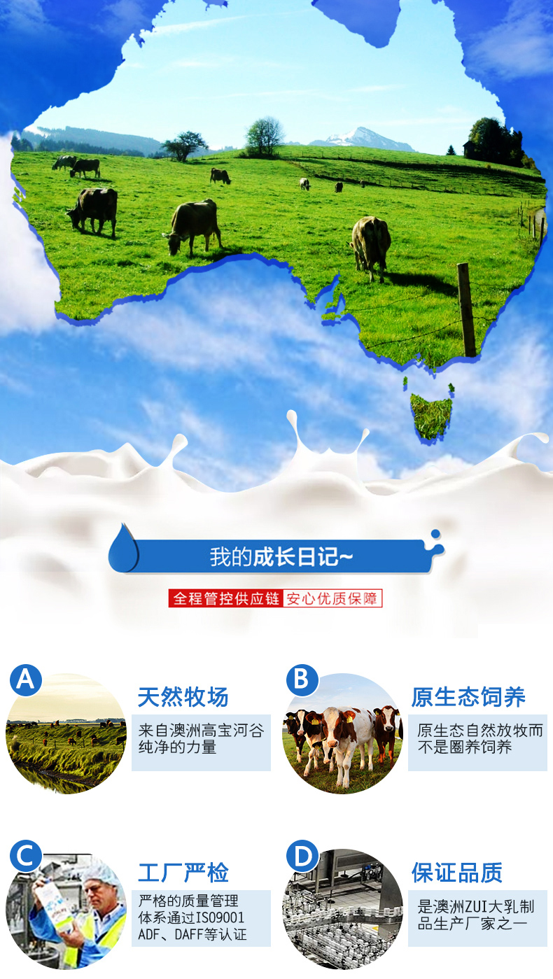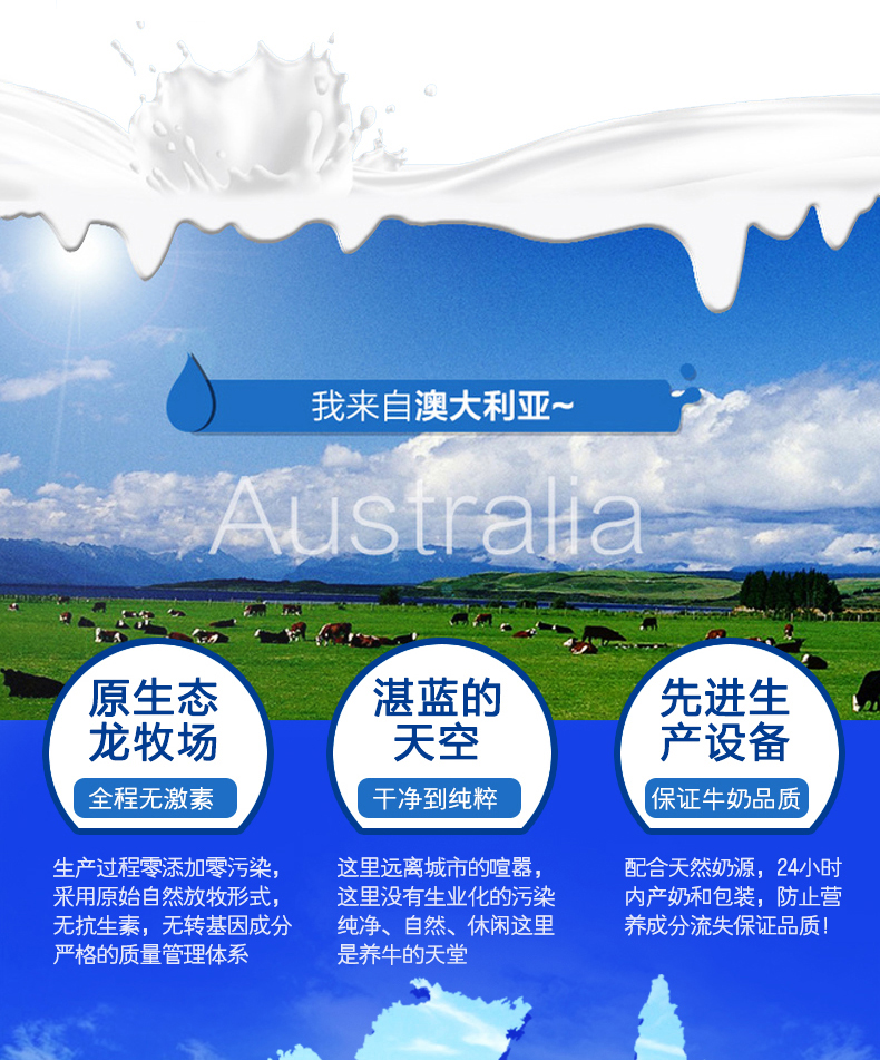 采用原始自然的放牧而非圈养的方式饲养奶牛。奶牛可以尽情享受大自然的新鲜绿草、纯净空气和饮用水。与此 同时,奶牛获得奶农良好的照料,没有压力,不受激素、抗生素和催奶剂的干扰。每100ml含钙112mg,是人体每天所需钙的一半,蛋白质高达3.3g,奶香浓郁浓郁,加热后有奶皮产生,无奶腥味,口感丝滑纯正,是补能量摄取蛋白质的上好饮品。