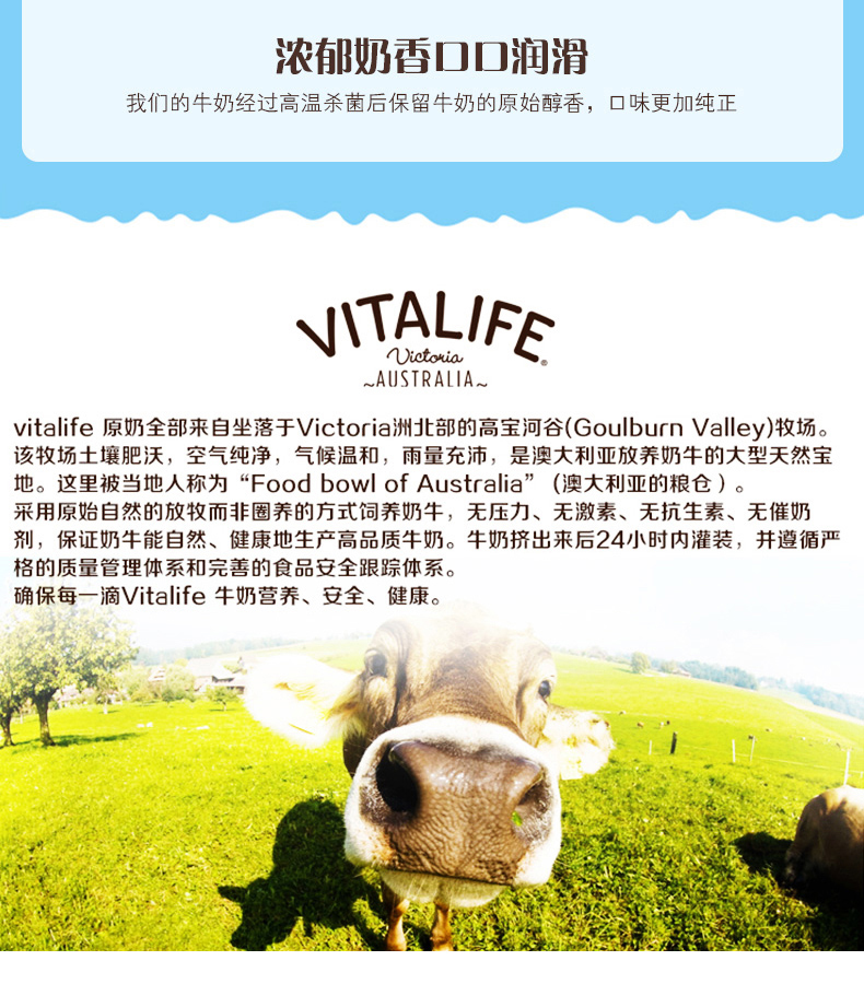 Vitalife牛奶由澳大利亚Pactum乳业集团(PDG)生产,PDG是澳大利亚自由食品集团(FNP)全资子公司,PNG是澳大利亚最大的乳制品上市公司之一,也是澳洲顶尖品牌A2牛奶的最大单一股东。原奶全部来自高宝河谷(Goulburn Valley)牧场。实现“从农场到餐桌”安全可靠,通过ISO9001、DAF、HQCCP、ORGANIC(有机)、盒HALAL(清真)认证。