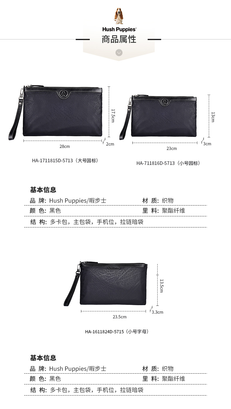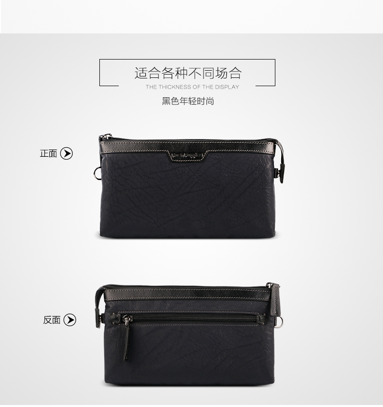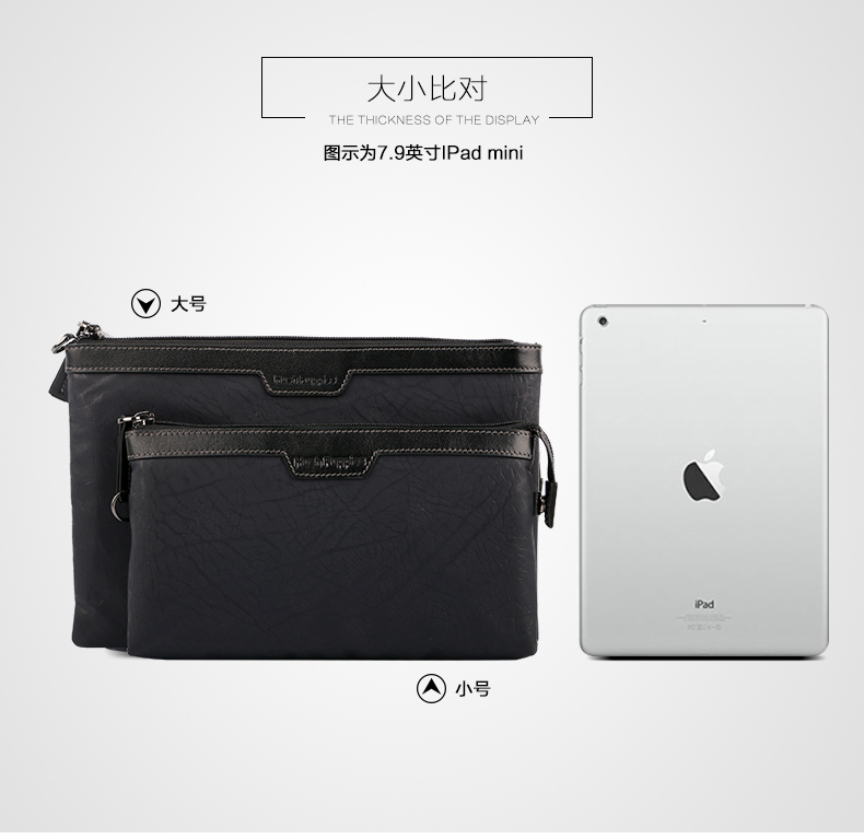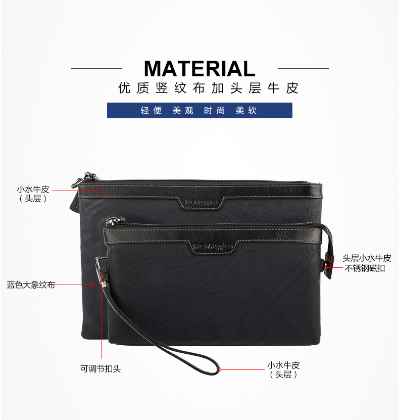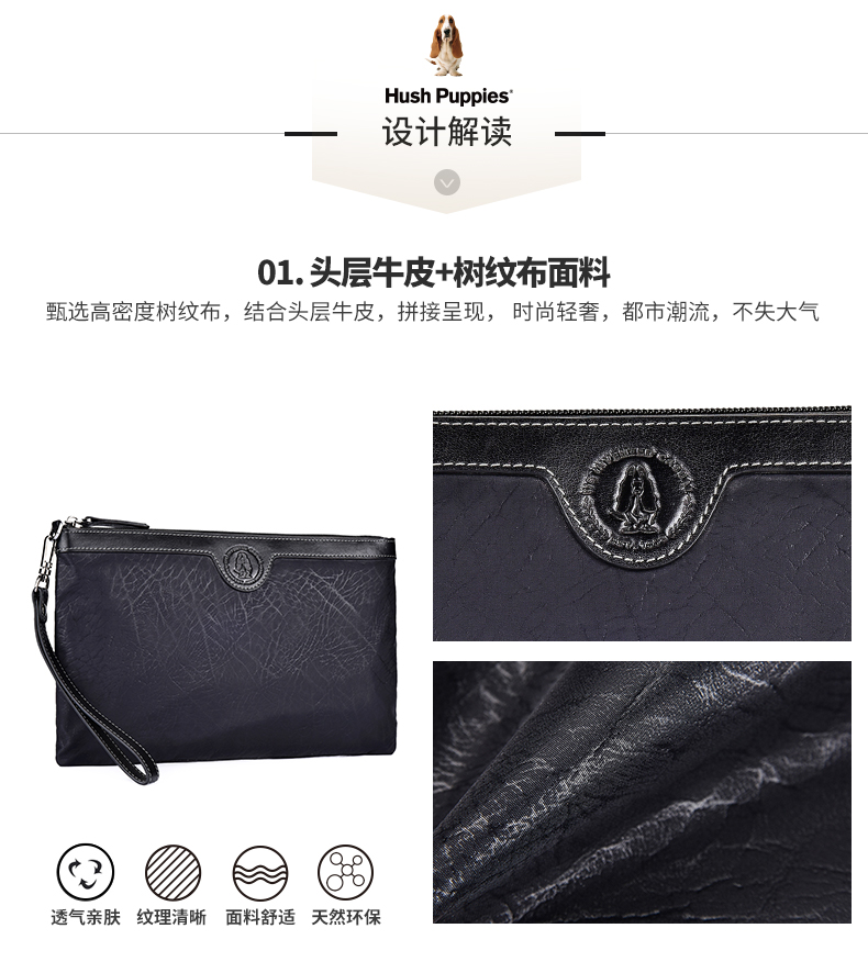 这款暇步士手包外形为经典的信封手包,设计简约,潮流感十足,商务休闲均可,顶端为头层的小水牛皮材质,质感十足,主料为高密度树纹布,手感柔软顺滑,持久耐用,所有五金件均为优质不锈钢材质,,质感十足,成熟男士出街的好选择。