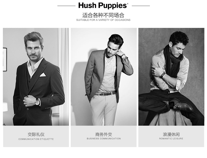 Hush Puppies(暇步士)品牌创于1958年,以著名的巴吉度猎犬为标志。其所畅导的舒适、物超所值的休闲感受成为美国现时代精神的体现,引导了欧美国家的休闲时尚。Hush Puppies所主张的舒适自然人文精神,成为世界唯一被公认为We Invented Casual(休闲由我创)的品牌。相比rockport和ecco来说,款式更具有潮流感。