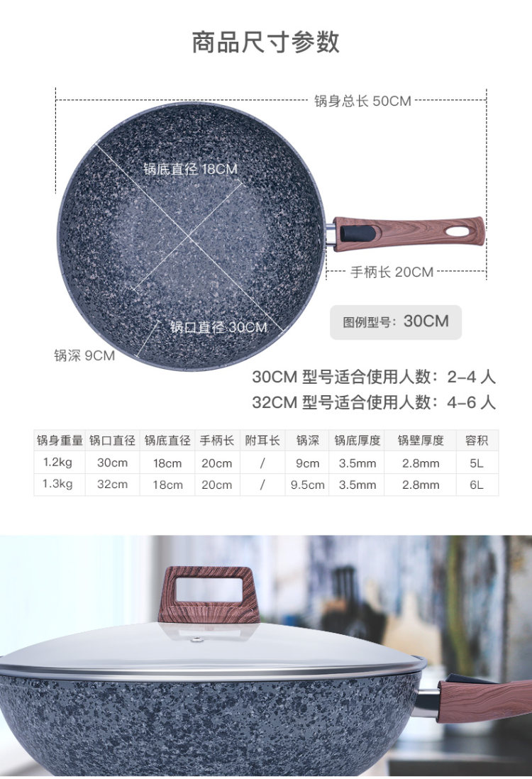 这款炒锅直径为30cm,深9cm,锅体是用花岗岩抗粘层、合金基底层、重压紧致层、纳米气垫层、不锈钢导磁快热层压制而成,非常耐磨,可做到100000次不粘;