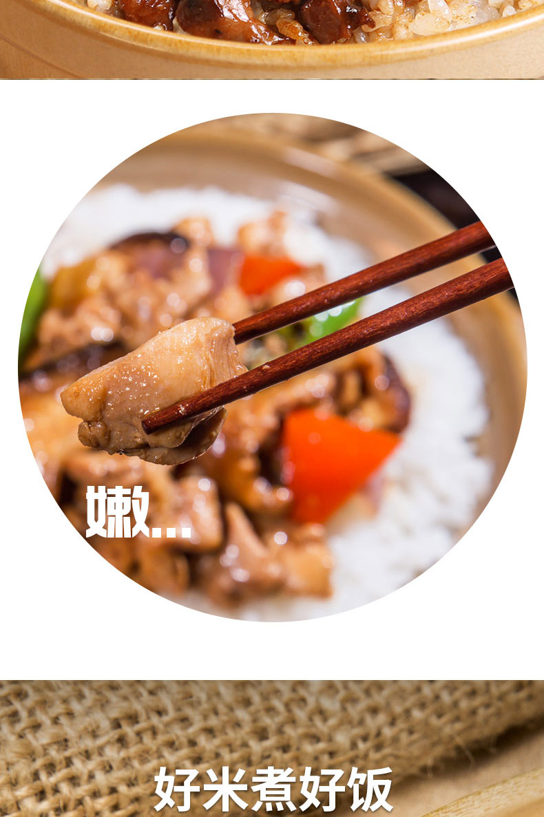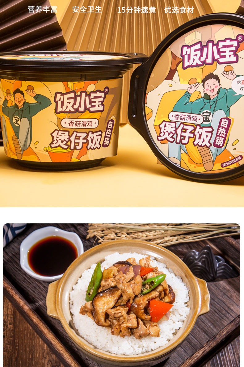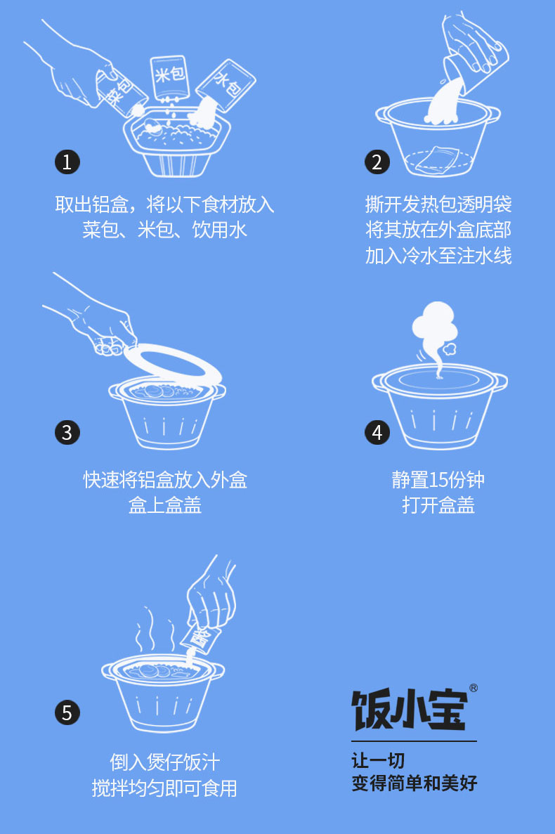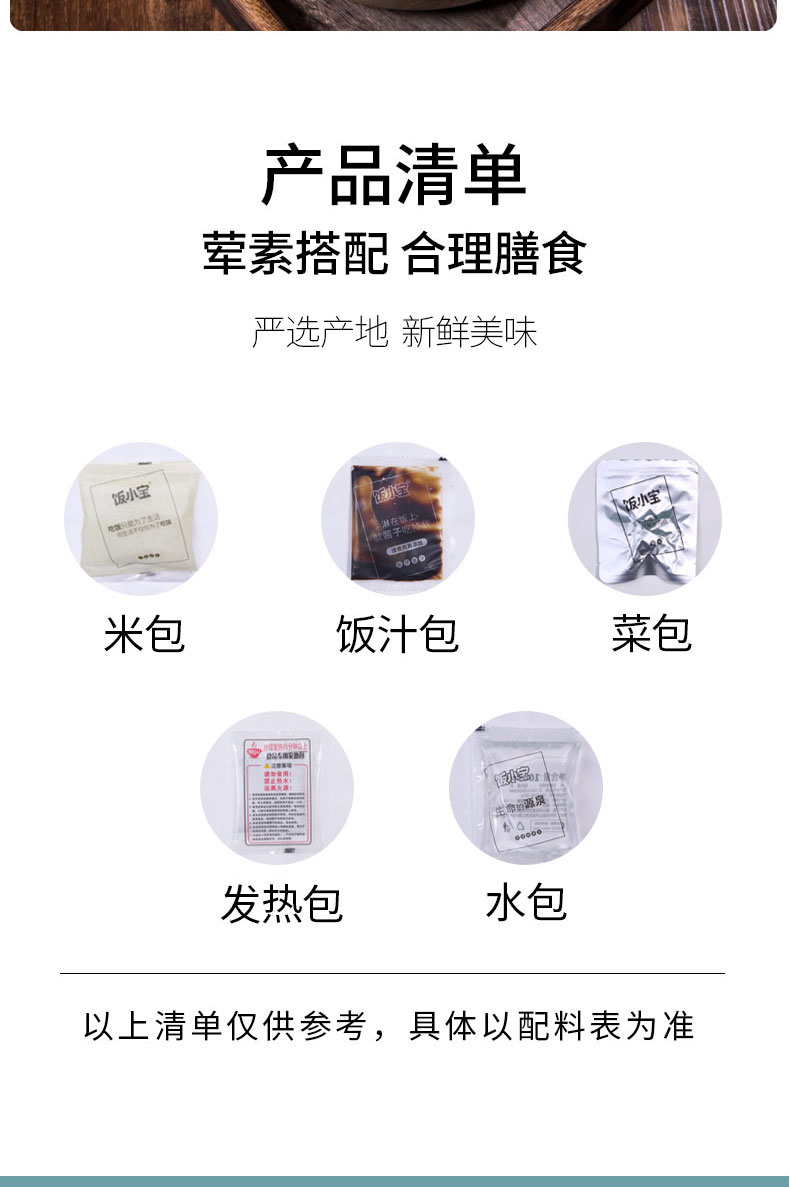 优选食材,采用FD真空冻干技术,可以锁住食物营养。复水后能迅速还原食品的色香味形美,营养不流失,口感和营养成分就和现煮的一样。含:米包、饭汁包、菜包、发热包、水包。采用食品级航空铝级餐盒,隔热性能强、安全环保,使用放心。