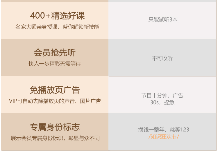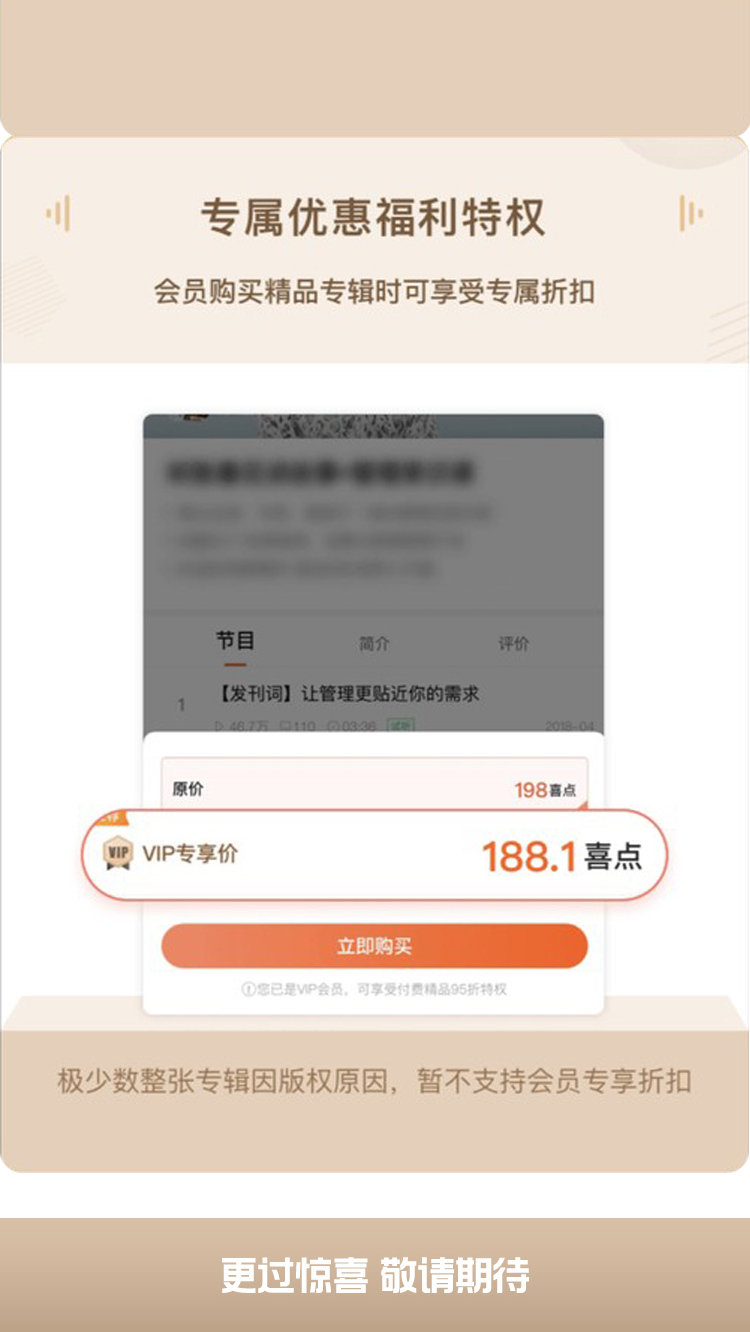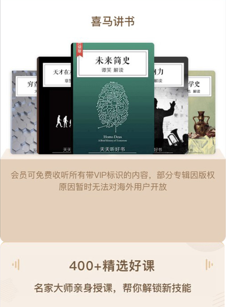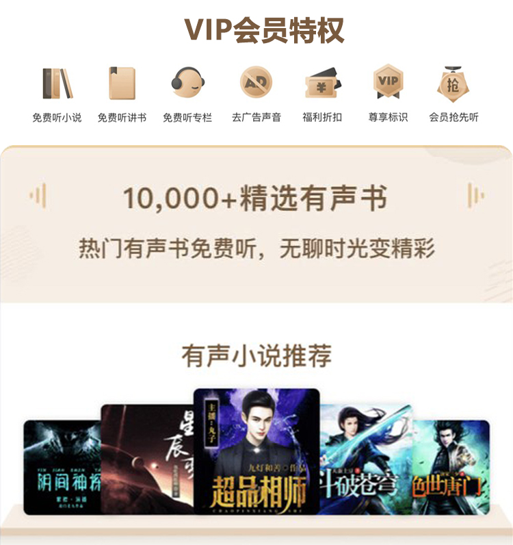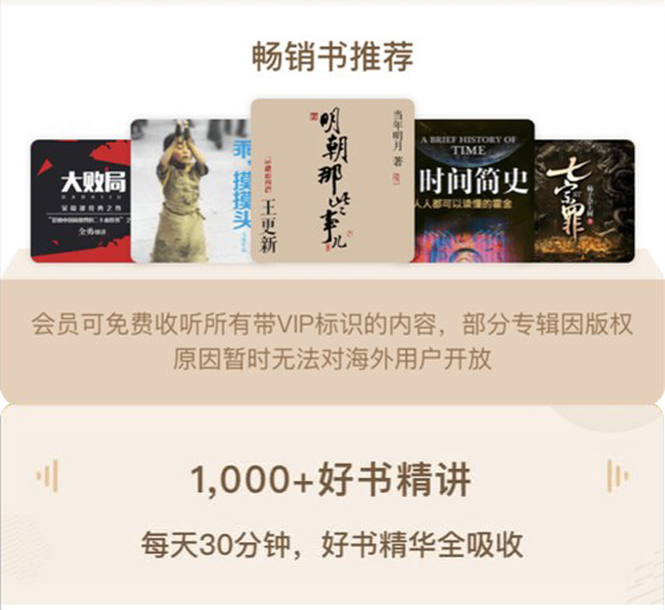 喜马拉雅VIP会员年卡包含174本经典书籍,28本付费费课程,2017本有声小说。天天好书畅听,每日更新,全年超过500本好书精华梳理。精选有声书免费畅听,畅听库已经覆盖90%,可每月可获得总价价值80元的4张专辑通用券,购买专辑还可以做到9.5折。