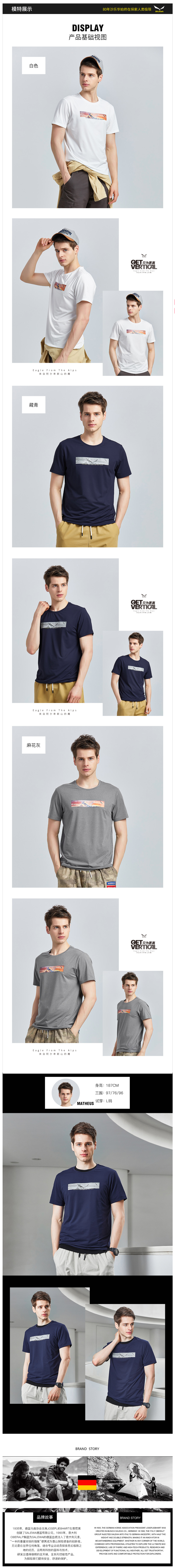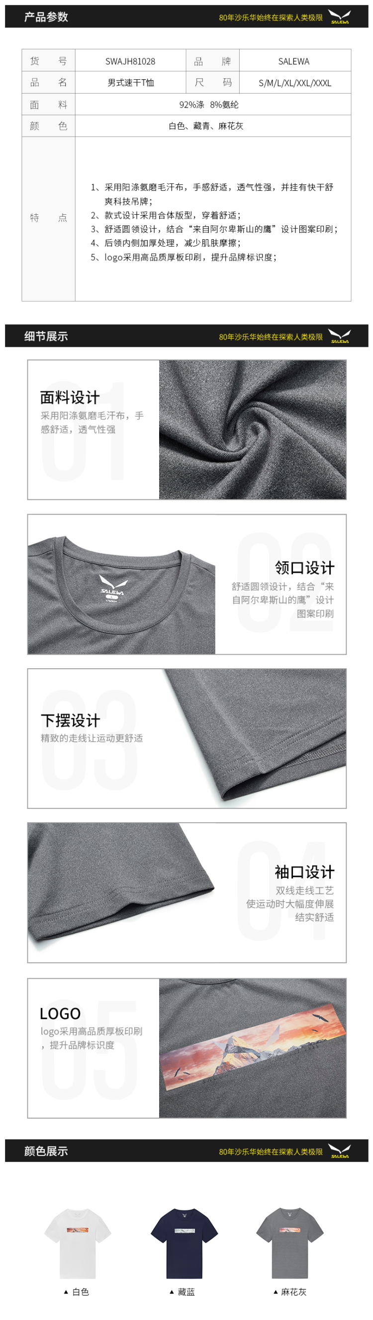 这款沙乐华T恤是2019年的专柜新款,定位日常通勤、徒步旅行穿着。面料选用92%阳离子涤纶、8%氨纶混纺而成,传统汗布织法,阳离子涤比传统涤纶具有更好的柔软、透气、吸湿性,还特别增加了磨毛效果,手感上会更好。