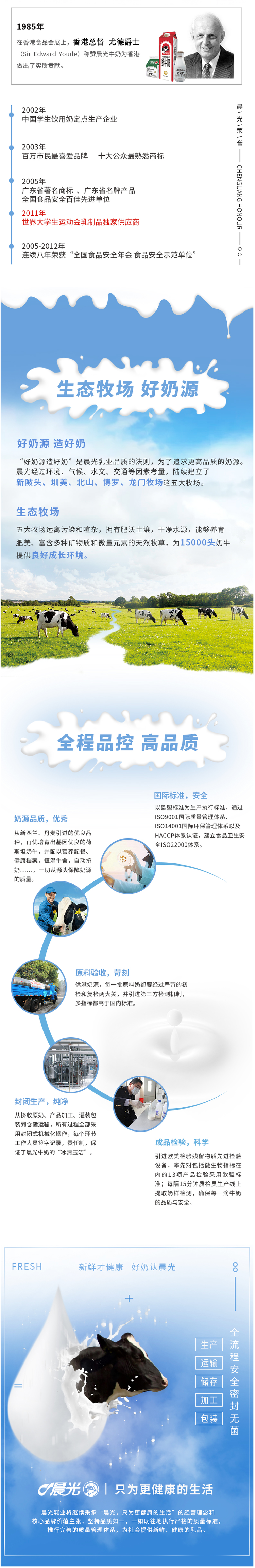 深圳市晨光乳业有限公司成立于1979年,次年5月正式投产,位于深圳市光明区,由晨光饮料公司、晨光牛奶公司、晨光贸易公司、晨光饲料公司四家知名企业合并组成。主要从事乳品的开发、生产和销售,奶牛和公牛的饲养、培育,物流配送,营养保健食品的开发、生产和销售。