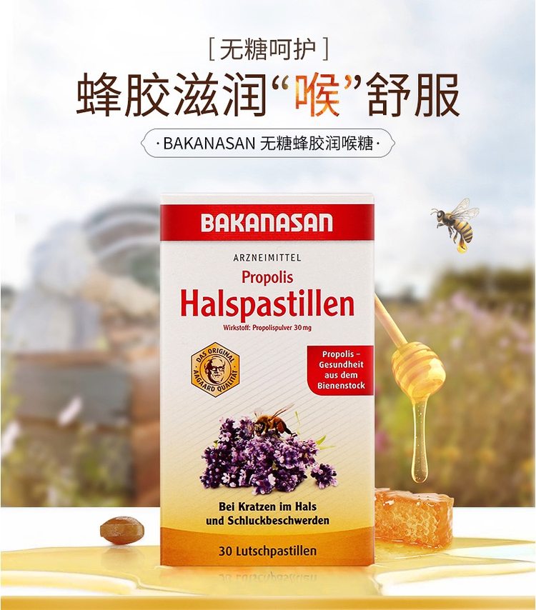 这款Bakanasan 无糖蜂蜜蜂胶润喉软糖,德国原产,采用无糖配方,大人、小孩、老人、病人都能食用,主要成分是蜂蜜、天然蜂胶提取物、桉树油,每粒含30mg蜂胶,有润喉护嗓缓解咳嗽,清除燥热舒缓肺部不适,清新口气,快速去除异味的功效。