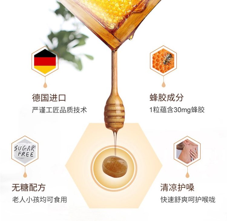欧洲品质的蜂胶,蕴含的润喉因子直达口腔;软糖结构,其独特的柔软口感,可以让儿童吞咽、老人轻松咀嚼,适合感冒喉咙痒、讲话干哑、喝酒喉咙痛、免疫力差,如老师、经常外出应酬、经常感冒的人服用,规格是30粒。