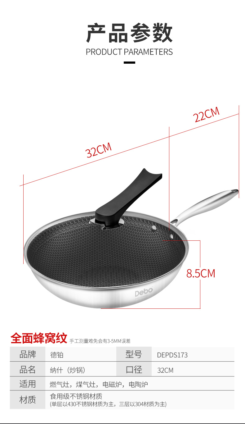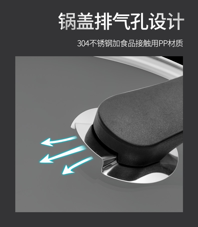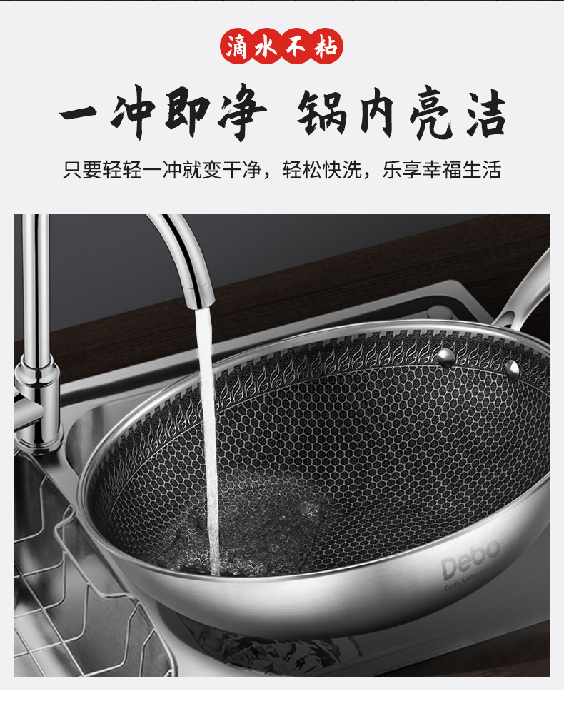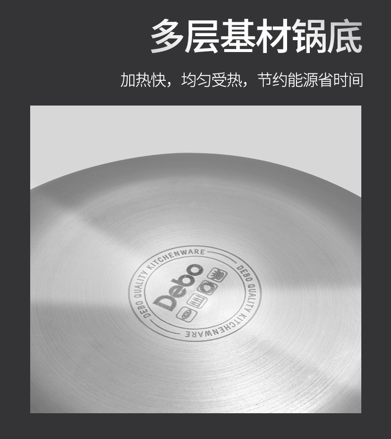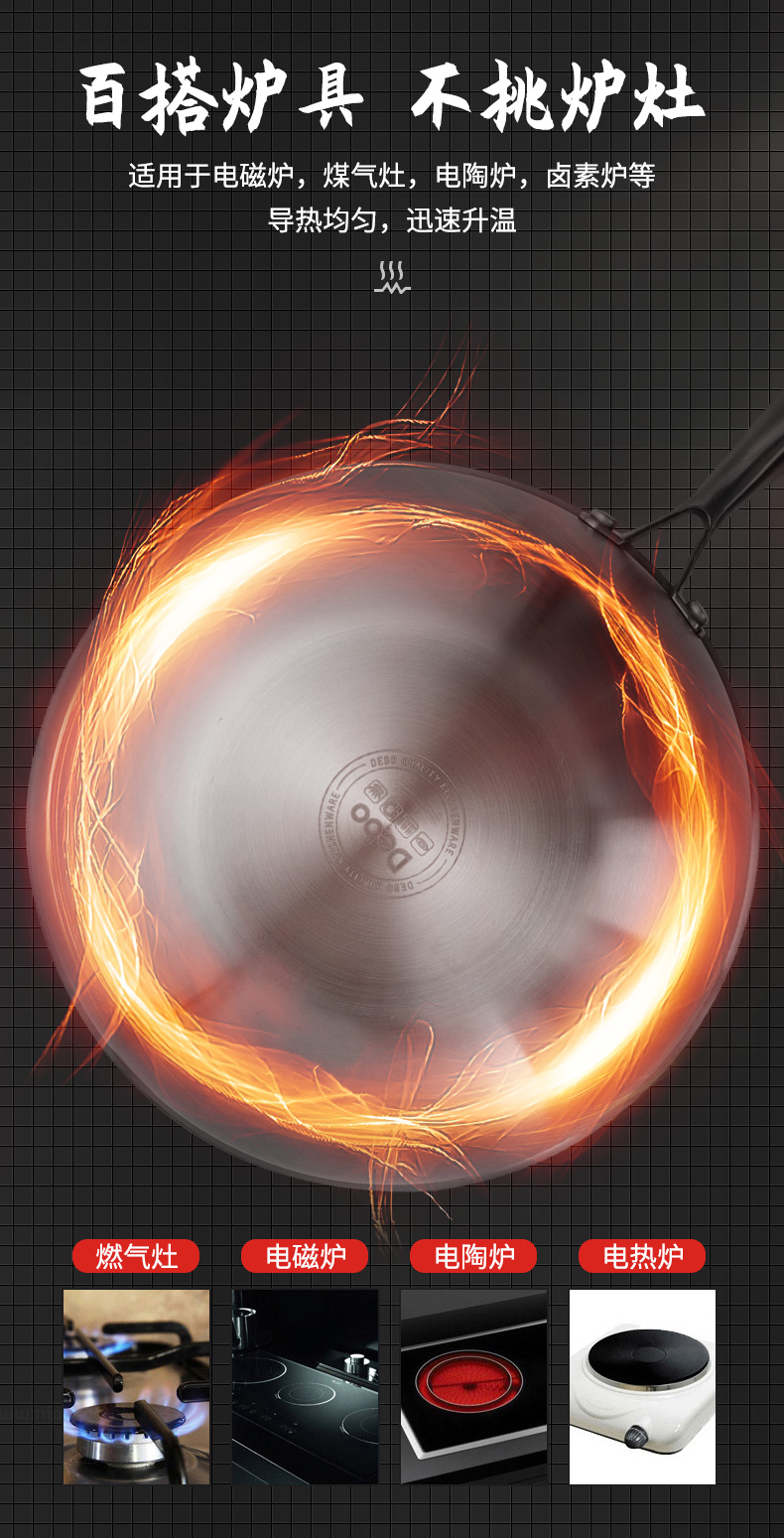 这款炒锅采用德国精工工艺,锅身采用304食品级不锈钢材料,使用安全健康;锅底为三层加厚设计,受热迅速而均匀;8.5厘米高锅深,煎炒蒸煮等都能做,燃气灶、电磁炉等灶台通用。
