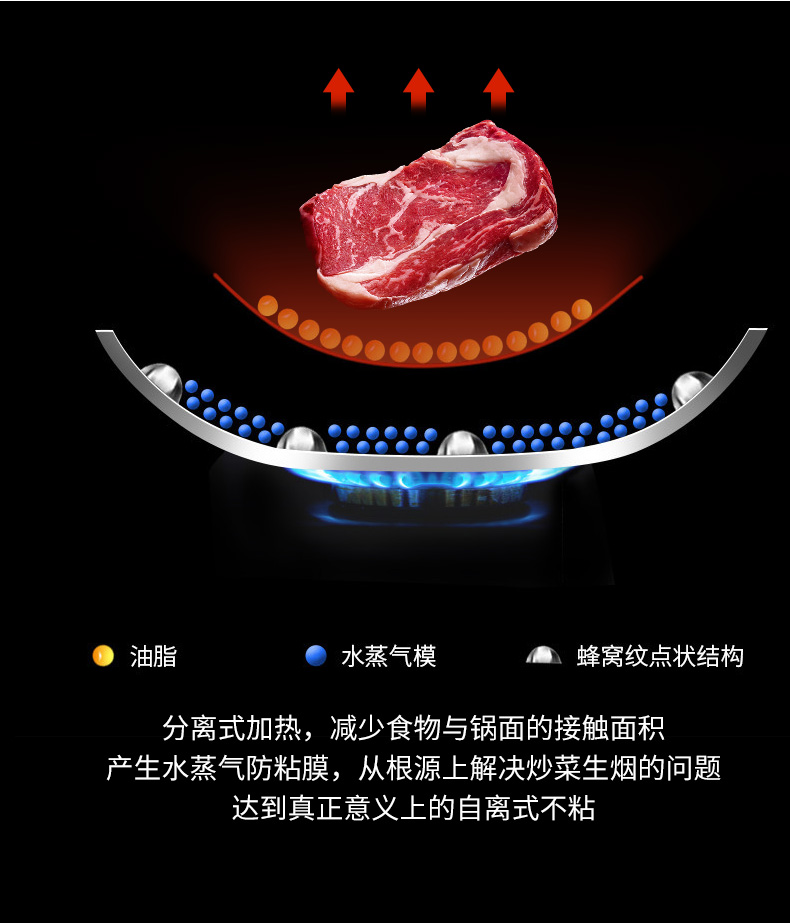 内层采用蜂窝悬浮技术,没有普通不粘锅的涂层,蜂窝纹之间会产生水蒸气膜,会使食物不接触锅底情况下受热均匀,翻炒轻松,不易粘锅,且能减少油烟、也不怕钢丝球破坏,极大提升不粘性能。