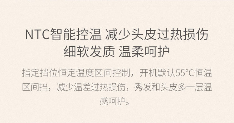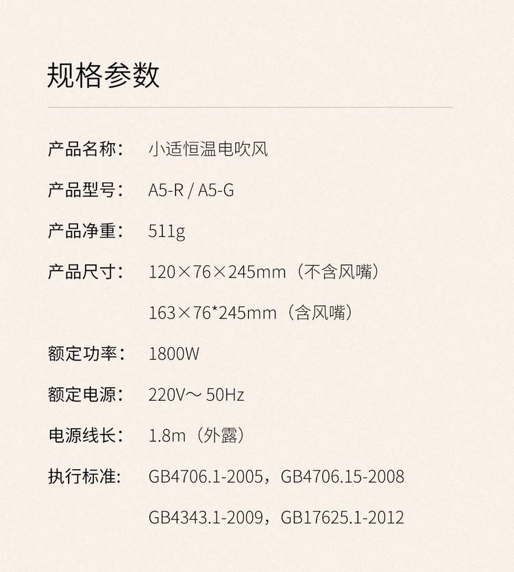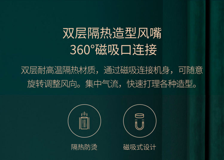 有冷风、热风2种模式,三挡可调;风嘴采用双层耐高温材质,通过磁吸连接机身,可随意调整角度,集中气流,快速打理各种发型,内置NTC智能恒定温控器,55度恒温区间,细软发质也可有效呵护,还精选了高灵敏度保险丝和主动过热保护装置,超出安全范围自动断电,双重保护更安全。