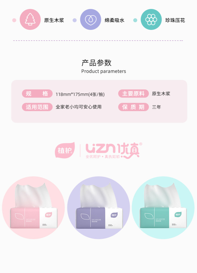 植护大牌,新品上市,简约三色包装,点亮精彩生活,原生木浆制作,四层加厚绵柔,珍珠提花压纹,细密柔韧纤维,科学健康亲肤,湿水不易破,拭擦不易掉屑,干湿两用,深层清洁,温和呵护你的娇嫩肌肤