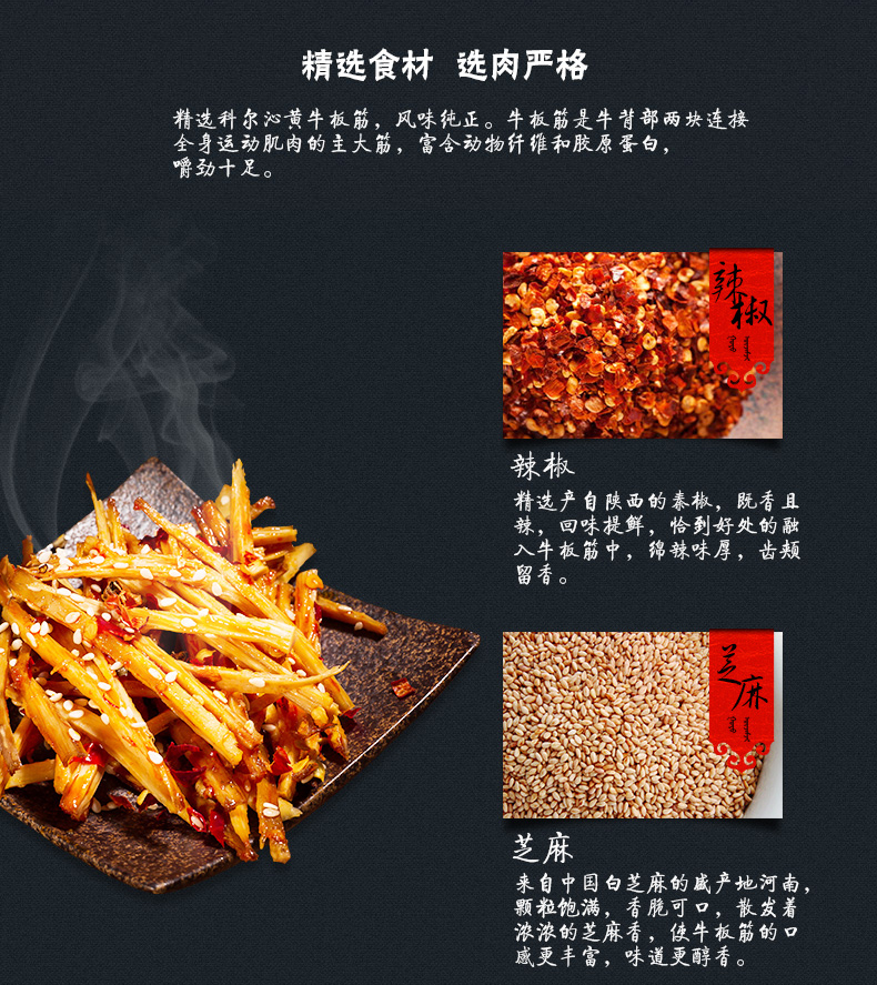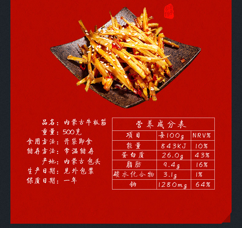 这款牛板筋精选科尔沁黄牛板筋制作,非碎筋压制,不掺其他肉类和豆制品,仅用盐、糖、香辛料入味,香髓入骨、细腻香辣,非常有嚼劲。独立小袋包装,开袋即食,方便携带。