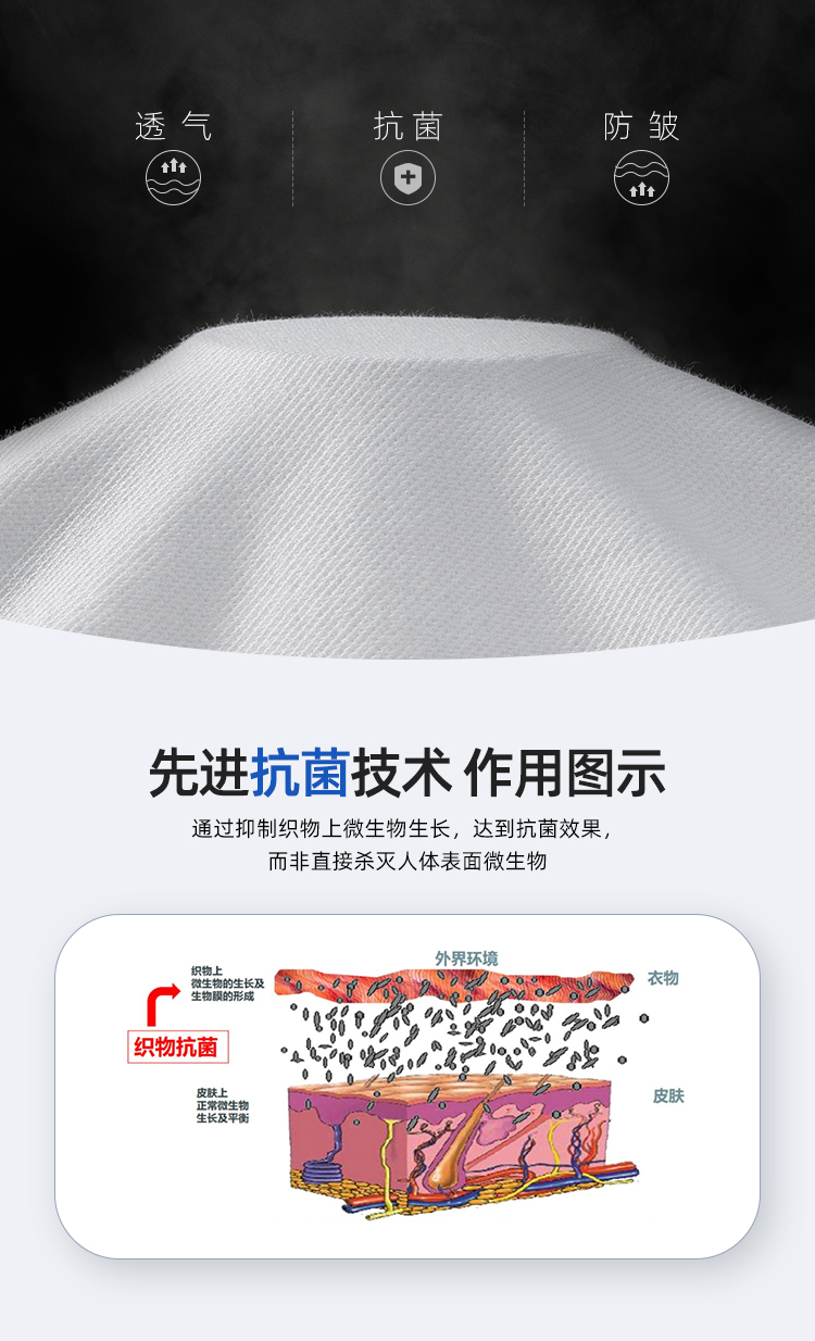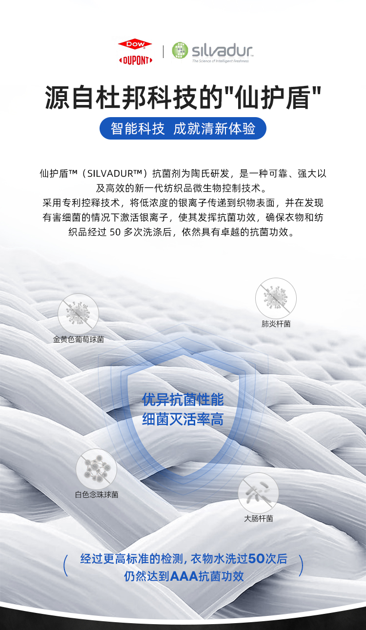 此外,面料中特别采用美国杜邦“仙护盾”科技,其中的抗菌剂可以控制并吸收细菌引发的异味,使衣服持久保持清新整洁。仙护盾可耐50余次洗涤,更为耐穿,持久去除异味。
