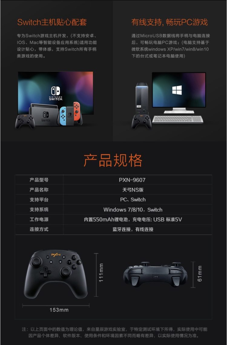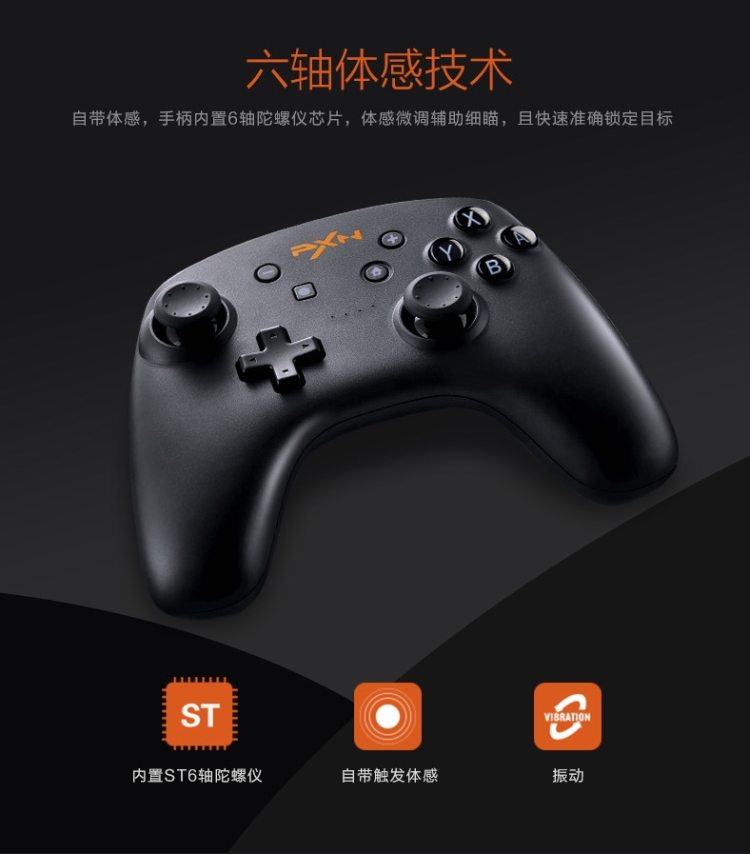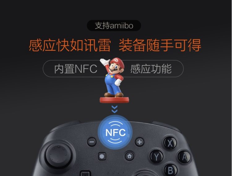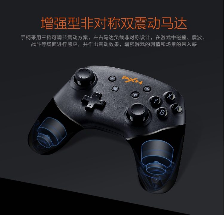 手柄内置了NFC感应功能,链接无延迟,还内置了6轴陀螺仪芯片,自带触发式体感;手柄处双边配备有增强型非对称双震动马达,有三档可调节震动方案,当在游戏中遇到碰撞、震波、战斗等场面时会自动进行感应,并作出震动效果,增加了游戏的剧情和场景的代入感。