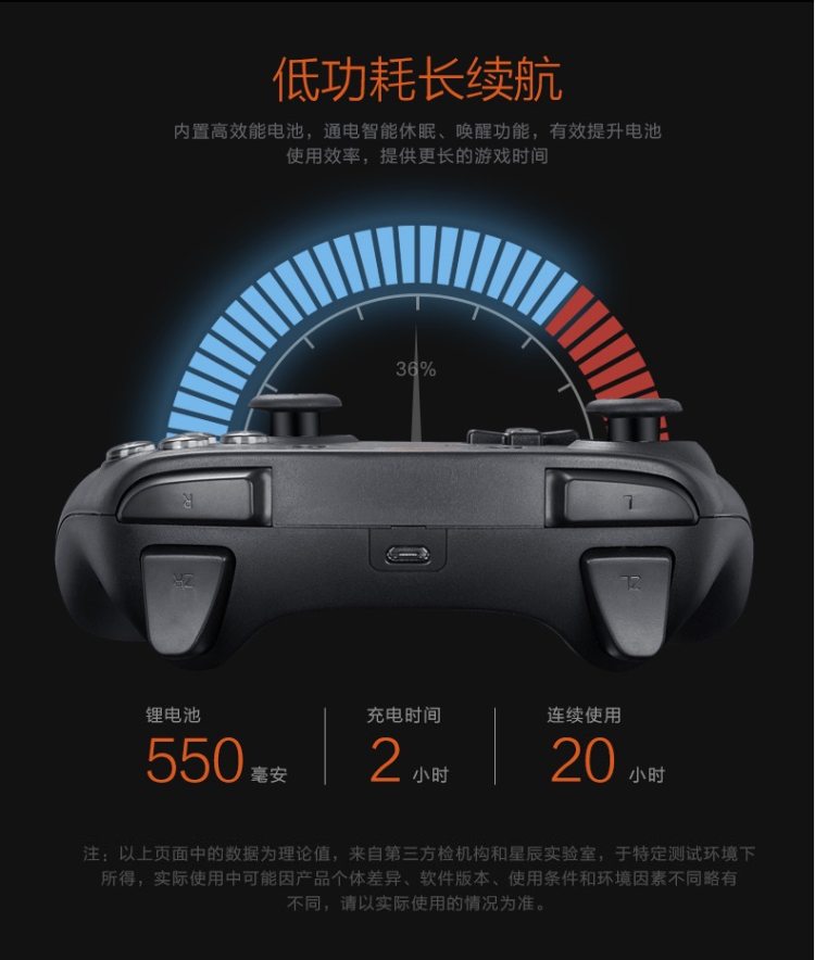 蓝牙无线芯片,高速率信号传输稳定不延迟,摆脱有线手柄的距离限制。内置550mAh高效能电池,充电2小时,可连续使用20小时。通电智能休眠,唤醒功能,有效提升电池的使用效率,提供更长的游戏时间。