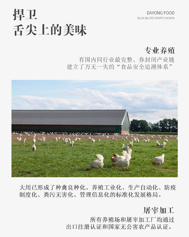 大用集团创建于1984年,实施ISO9000质量标准要求和HACCP控制体系,速冻调理禽肉熟食加工厂通过了日本、韩国、马来西亚、新加坡等国家的官方认证。同时,大用也成为了肯德基、麦当劳、德克士等国际快餐业巨头鸡肉原料供应的重要合作伙伴。