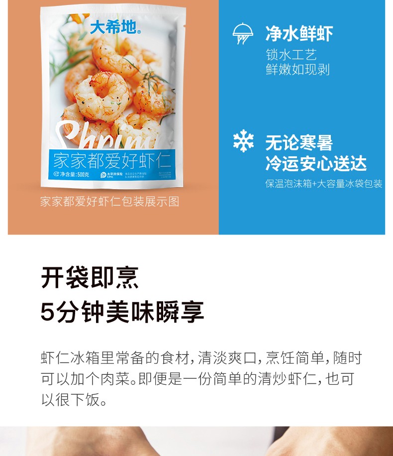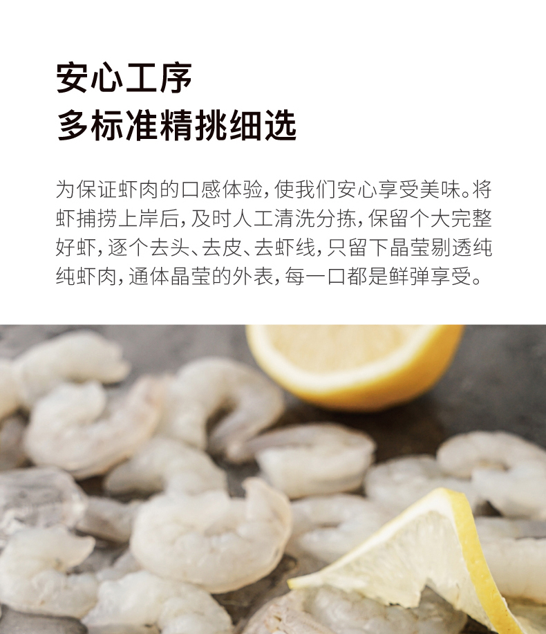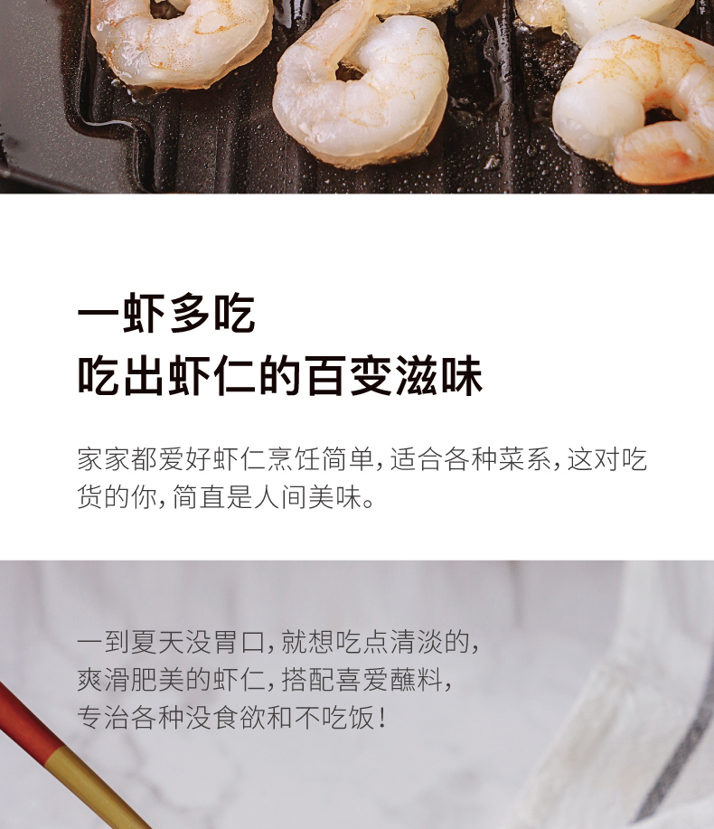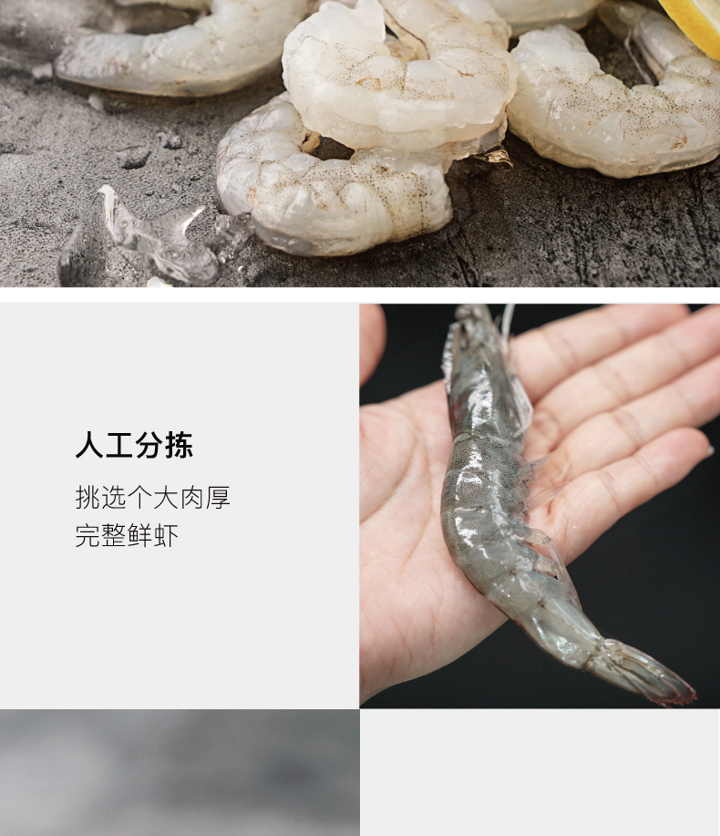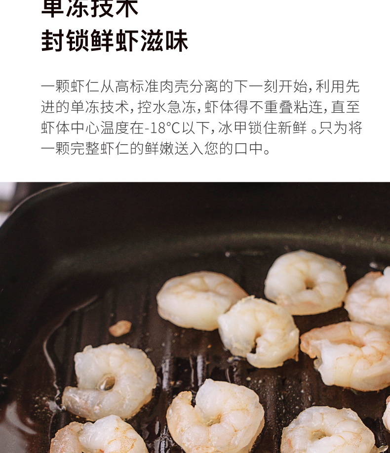 这款大希地虾仁,源自南海捕捞的南美白对虾,上岸后整虾去壳取肉,手工去虾线。分离出虾仁之后,控水急冻,虾体得不重叠粘连,直至虾体中心温度在-18℃以下,冰甲锁住新鲜。
