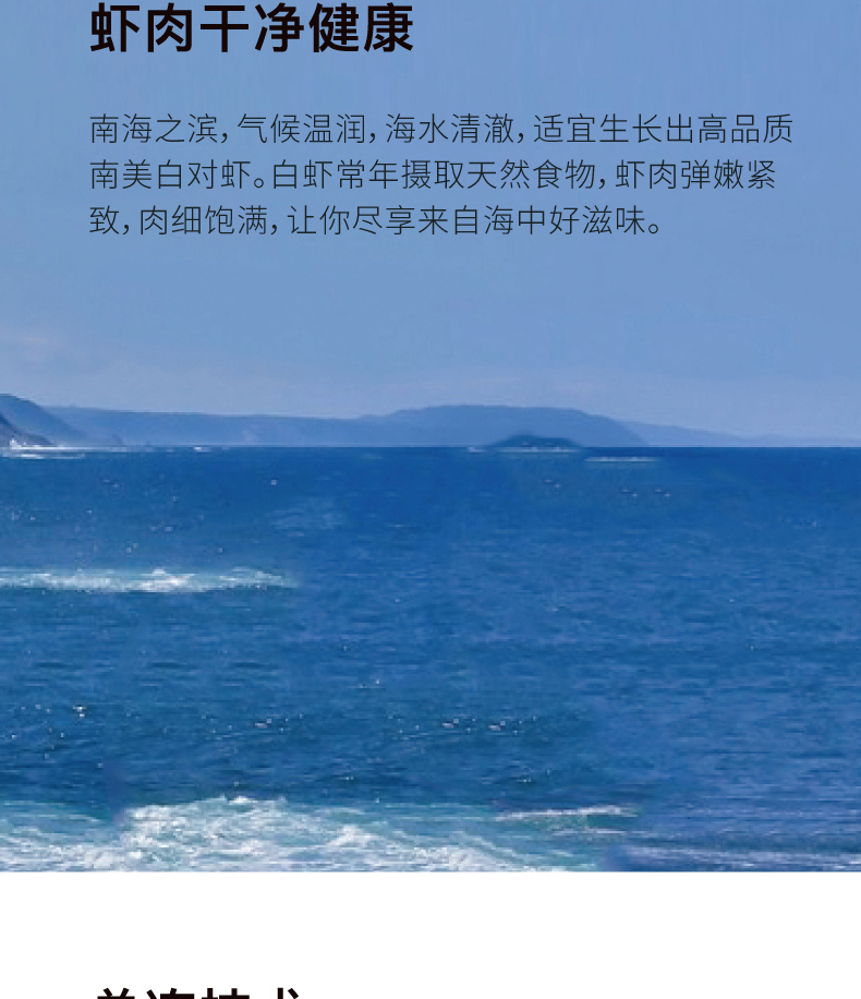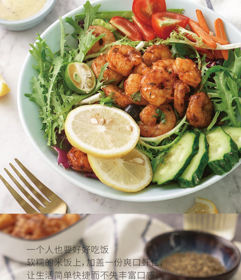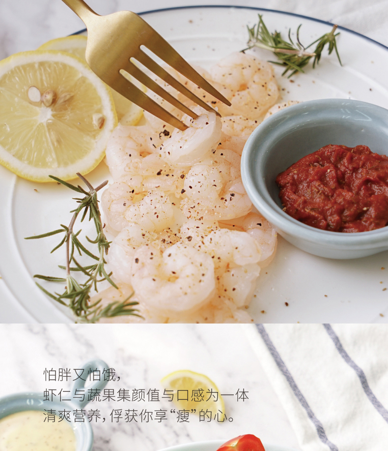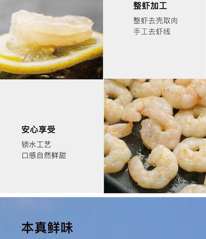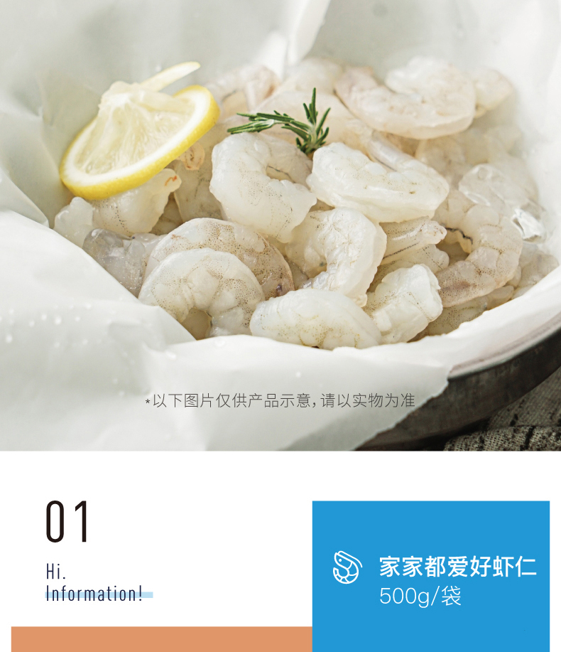 这款大希地虾仁,源自南海捕捞的南美白对虾,上岸后整虾去壳取肉,手工去虾线。分离出虾仁之后,控水急冻,虾体得不重叠粘连,直至虾体中心温度在-18℃以下,冰甲锁住新鲜。