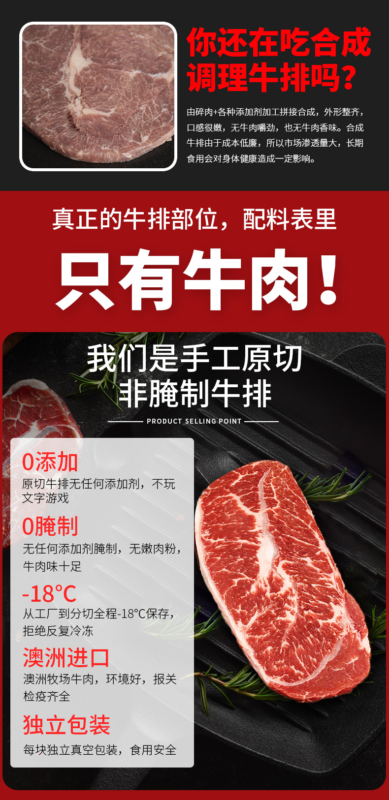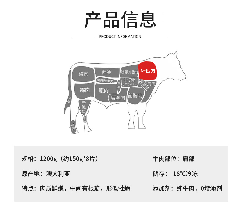 原切0增添剂 ,顺丰发货,厚切8片1200g,口感非常扎实。澳洲进口,选用谷饲100天以上牛的肩胛部位,整块原切非腌制0添加,这个部位肉质油花丰富,中间带有明显一条软筋,因形似“牡蛎肉”而得名,因少有活动所以肉质细嫩,肥瘦相间,雪花纹理清晰,口感超细嫩,0添加,老少皆宜,适合煎、炒、烤等~~。