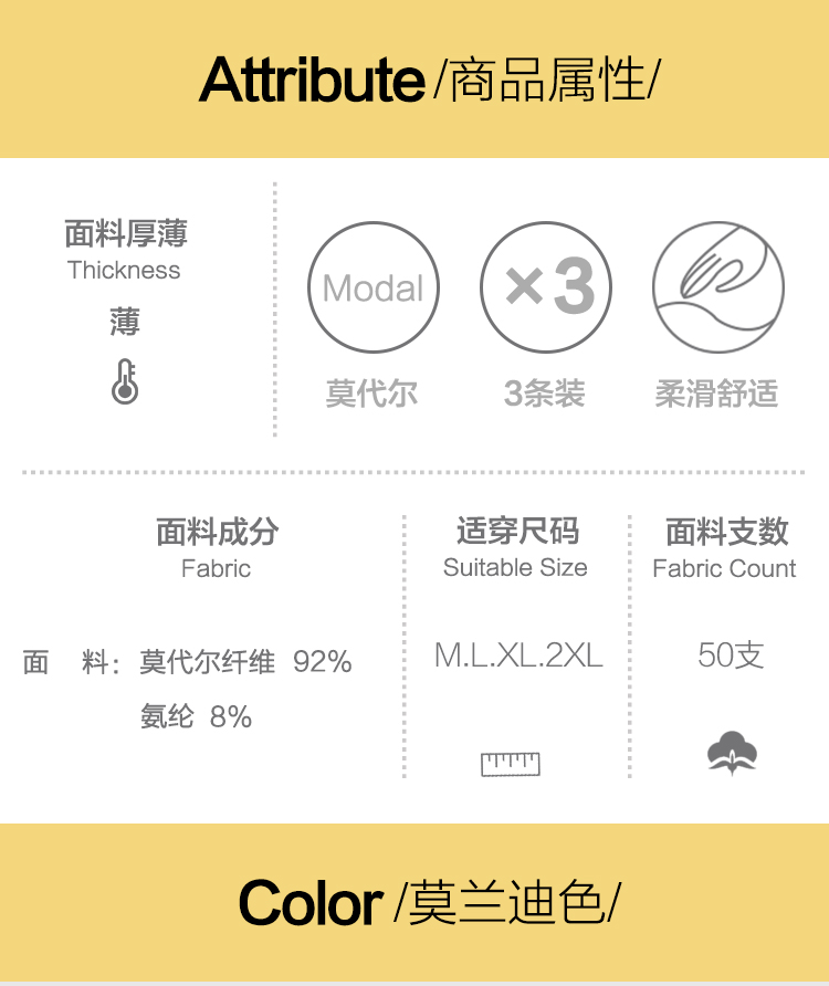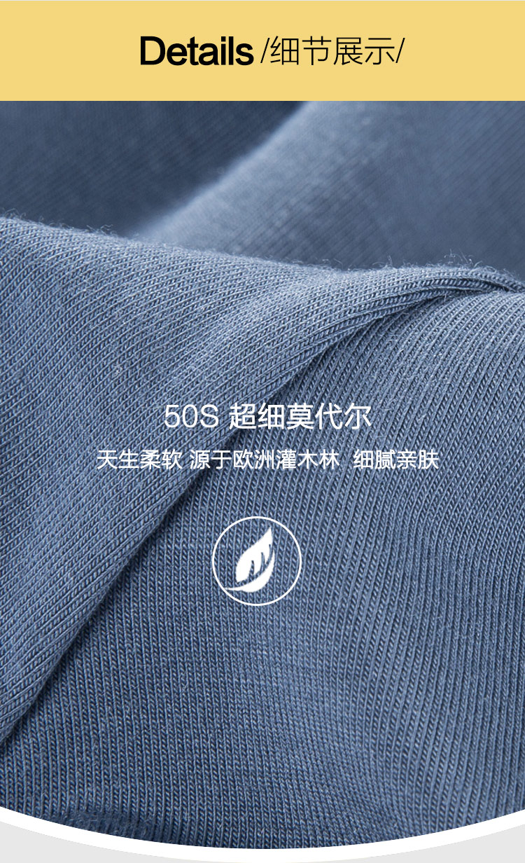 和纯棉面料相比,莫代尔手感更柔,吸湿更快更干爽,连续穿几天也没有棉质内裤松懈。莫代尔面料要混入氨纶弹力纤维,拥有弹力贴身的穿着感,又不会像尼龙或聚酯纤维有明显的紧绷感。