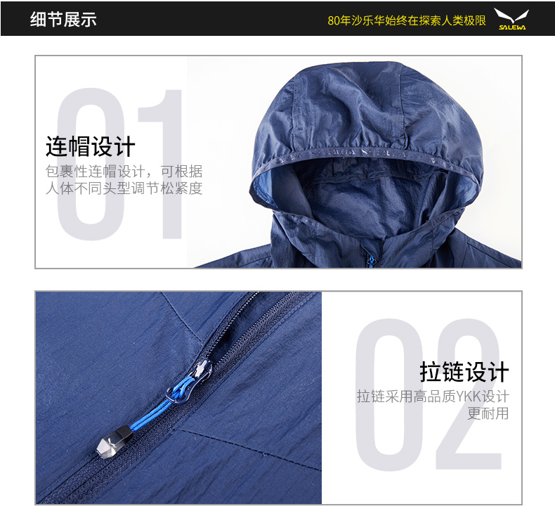 沙乐华这款皮肤风衣是2018款,面料使用100%轻薄抗撕裂尼龙面料,面料强度高,99%防风,各方面均优于聚酯纤维。在设计与细节上,帽边与袖口均带有包裹性,下摆可调节收紧度,可通过收紧避免灌风。主拉链也是YKK的,