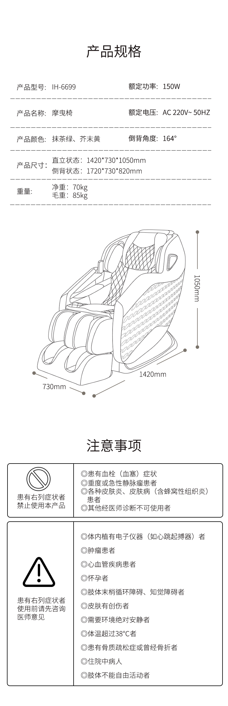 ihoco是奥佳华集团旗下健康生活品牌,2019年也荣登国产按摩椅十大品牌,产品质量靠谱。此款IH-6699按摩椅,全身气囊包裹、8大自动程序:男士、女士、舒眠、快速、肩颈、全身、腰臀,可以说非常全面了。有人问为啥没有儿童,儿童骨骼没发育完成,理论上讲是不赞成儿童使用按摩椅的。