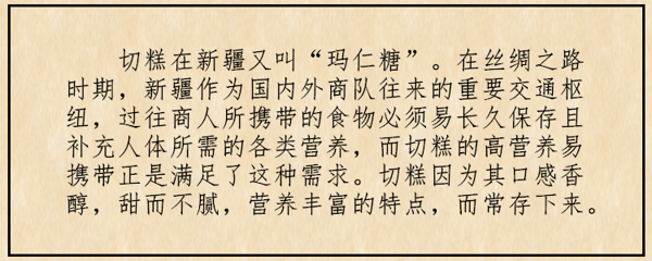 在新疆切糕被称为“玛仁糖”,是新疆维吾尔族民众的特色传统美食,极具西域风情。最早可以追溯到丝绸之路时期,作为长期旅途商人的干粮。切糕主要是以新疆当地的坚果作为原料制成,甜儿不腻,营养丰富。就连《舌尖中国》第二季第三集30分43秒中也有介绍。