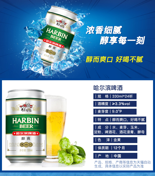 天猫哈尔滨啤酒旗舰店49.9元,可领10元优惠券,实付39.9元到手,共330ml*24听,约合1.4元一听,比可乐矿泉水都便宜。优选啤酒花、国内外优质大麦、优质酵母、和优质水源酿造而成,酒液色泽金黄,口感平顺,清冽甘醇,泡沫很浓厚。酒精度≥3.3%vol 麦芽度9。