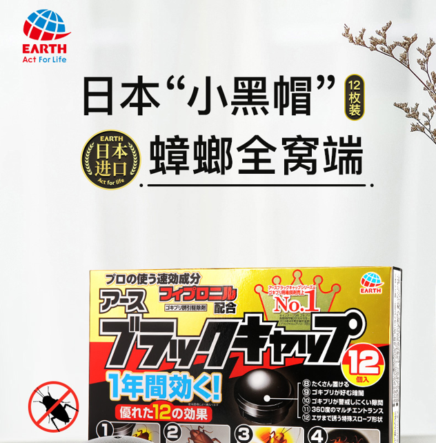 日本蟑螂药NO.1,“小黑帽”采用五种成分半生熟饵剂,安全无毒无害不含农药。强力引诱一只取食,然后携带病毒回窝传染连窝端,时效长达12个月,小黑屋设计,防止宝宝宠物误食,蟑螂喜暗更爱进,360度全方位引诱,各类蟑螂,全面消灭。