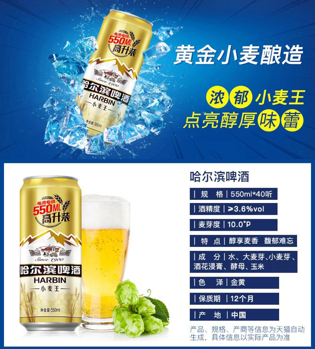 这款哈尔滨小麦王啤酒优选黄金小麦酿造,传承百年哈啤醇正风味,口感平顺甘醇,泡沫浓厚,麦芽度为10.0°P,酒精度≥3.6%vol。规格550ml*40听。