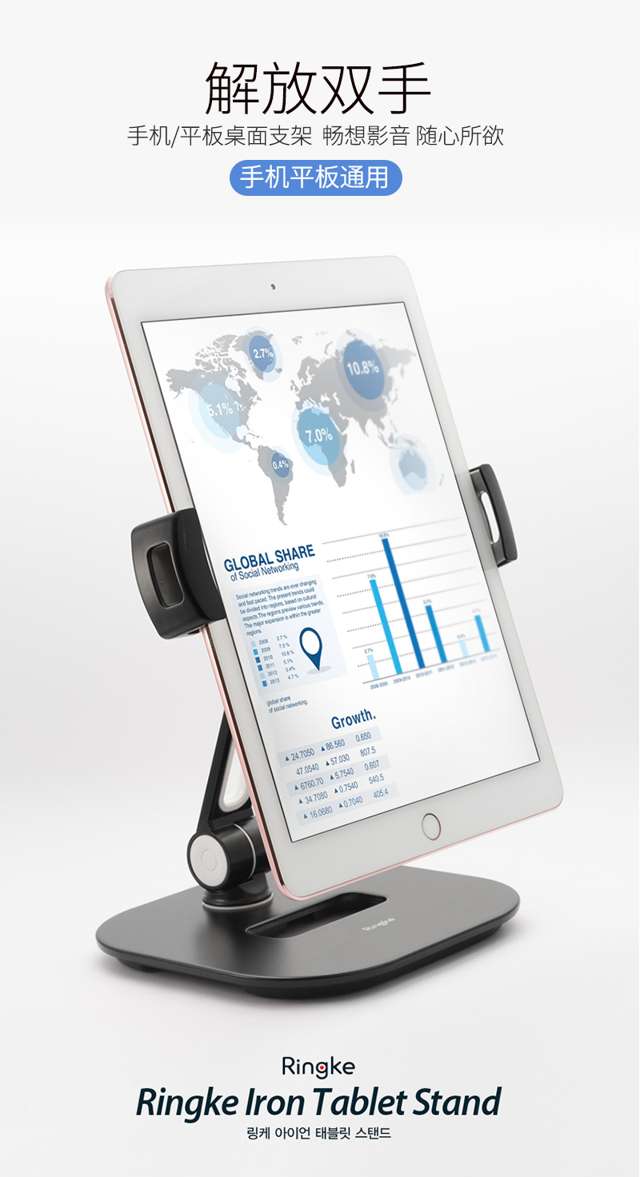 这款韩国 Ringke桌面支架,手机平板通用,可360°随意旋转。夹子两端内侧是硅胶防滑材质,以防止对设备产生划痕。预留了手机充电接口,底部是用锌合金螺丝固定,保证稳固不晃动。