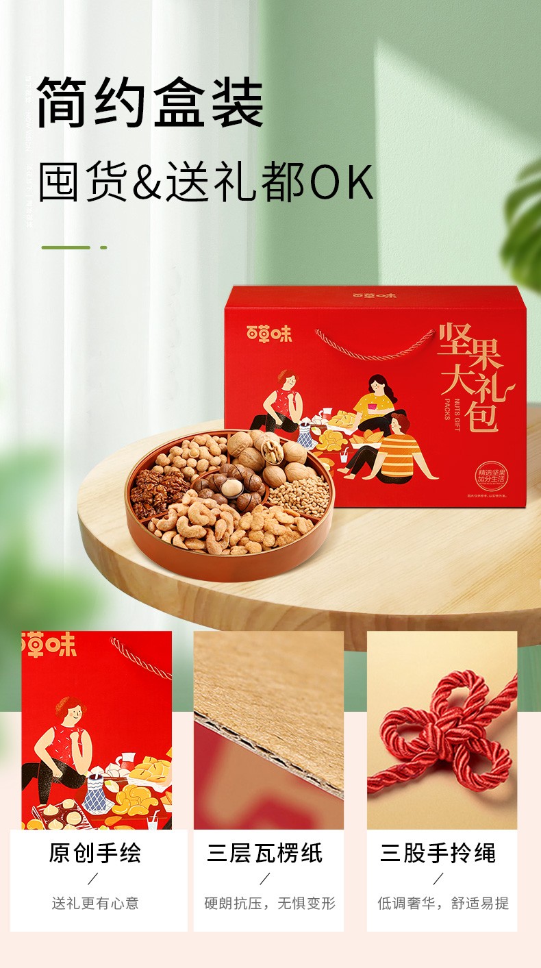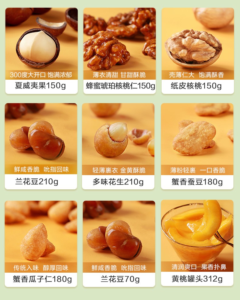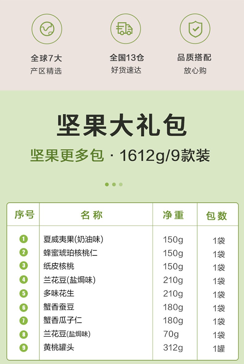 这款百草味坚果大礼包,总重量1612g,一共9种坚果,分别为:夏威夷果(奶油味)150g、蜂蜜琥珀核桃仁150g、纸皮核桃150g、兰花豆(盐焗味)210g、多味花生210g、蟹香蚕豆180g、蟹香瓜子仁180g、兰花豆(盐焗味)70g、黄桃罐头312g