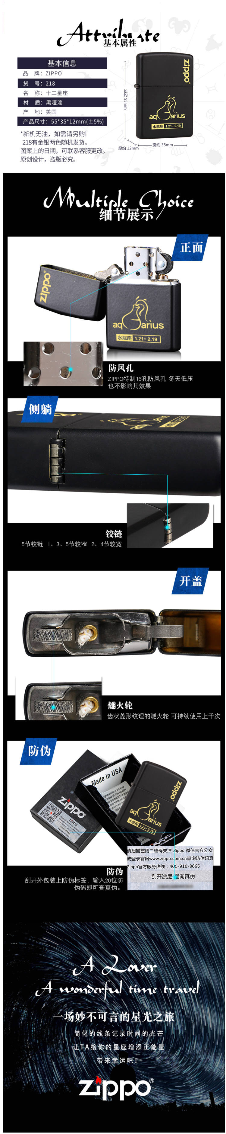 这款Zippo 2星座系列 防风打火机,于2018年的冬季款,美国原产(火机底部印有made in USA),刮开外包装上的防伪标签,在官网上输入20位防伪码即可验证真伪。