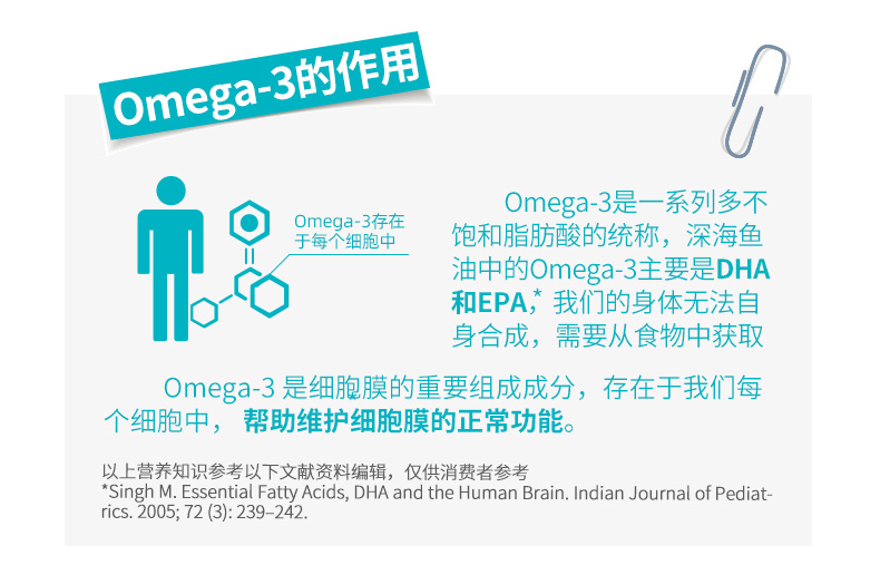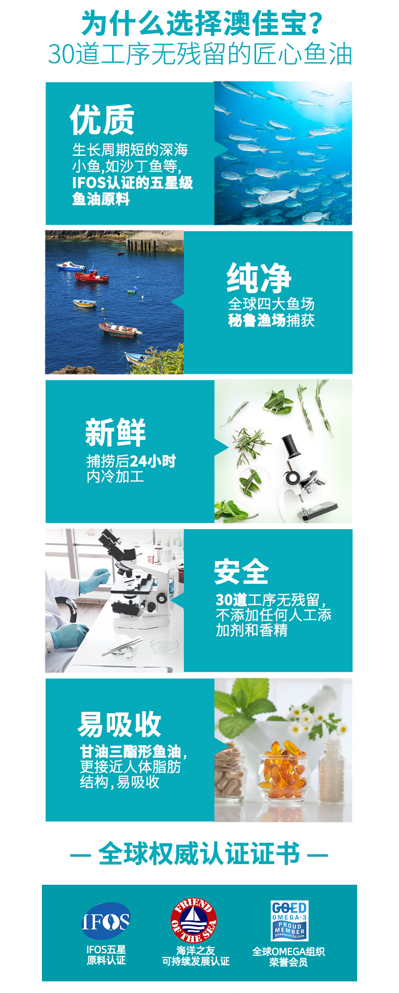 选用南太平洋天然无污染的深海鱼为原料,IFOS五星级认证,捕捞后24小时内冷加工。历经30到工序无任何人工添加剂和香精。每粒含Omega-3不饱和脂肪酸300mg,以及180mgEPA和120mgDHA,更容易被人体吸收,呵护心脑血管健康,提高免疫力,降低血脂,提高记忆力,保护视力等。