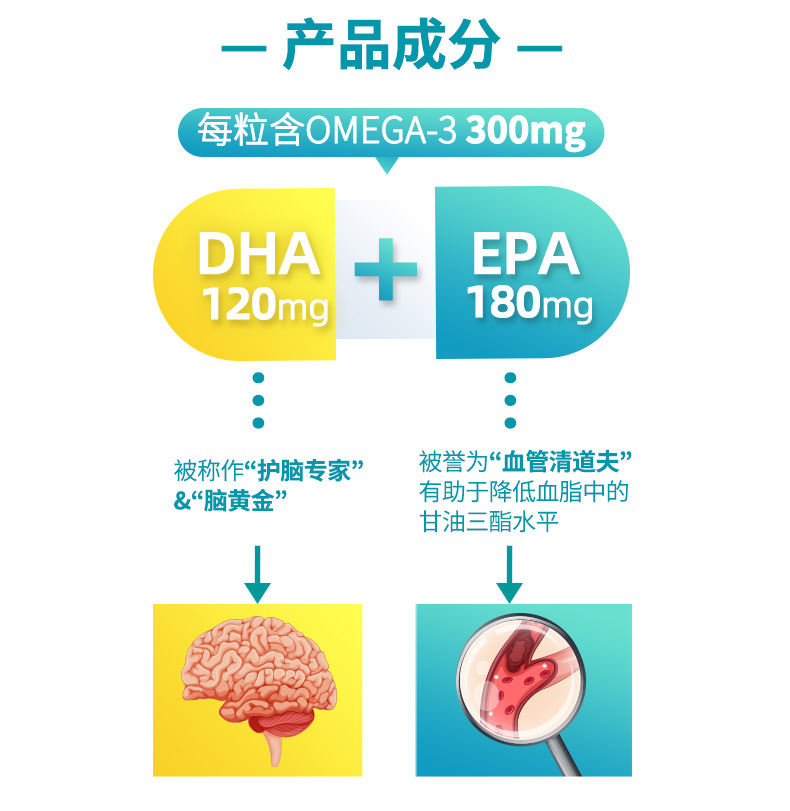 EPA:被誉为“血管的清道夫”有助于血管通畅,饱和脂肪酸代谢,降低血液胆固醇含量,降血压,预防动脉粥样硬化、血栓、高血脂、高血压等;