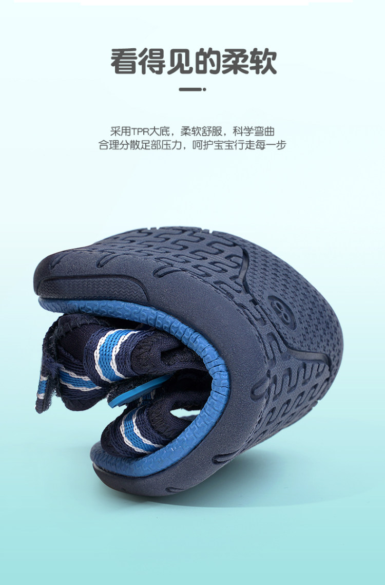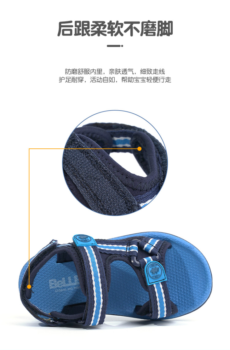 这款凉鞋内部是亲肤透气的织物面料+柔软舒适的TPR大底,科学弯曲,舒适耐磨,可合理分散足部压力,鞋边稳固不开胶,开放式魔术贴设计,调节松紧更便捷,胖瘦宝宝都可穿。