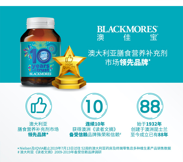 Blackmores,又名澳佳宝。是澳大利亚本土的保健品品牌。成立于1930年,已经有近87年历史。在1985年5月正式成为上市公司。目前拥有超过400名员工 ,总部设在澳大利亚悉尼。销售的国家包括澳洲、新西兰、马来西亚、新加坡、泰国、韩国、中国台湾、香港及大陆地区。