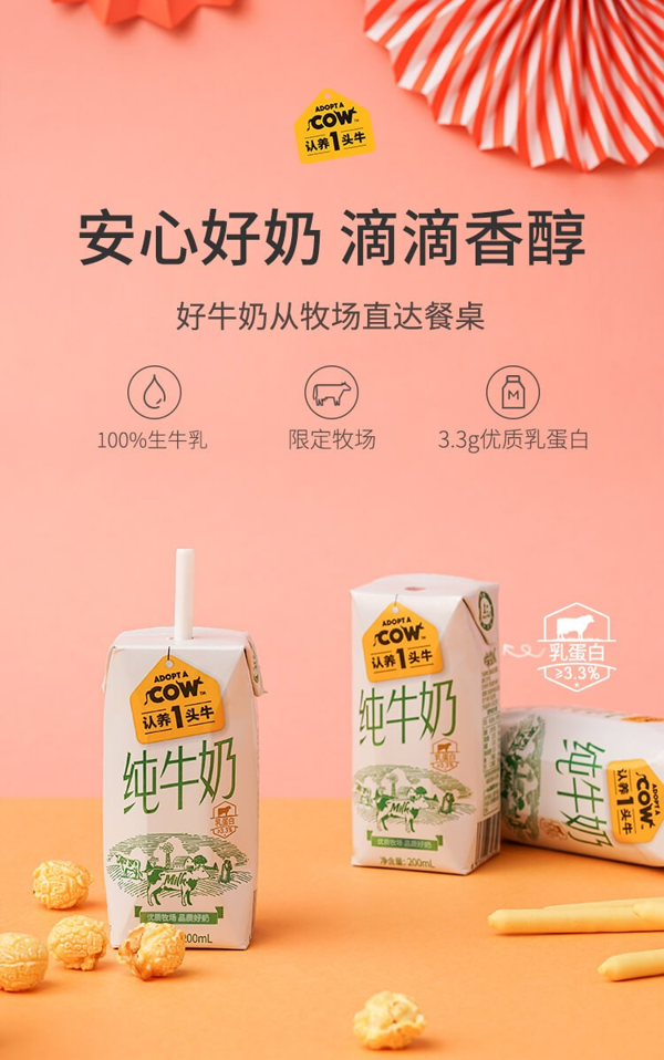 认养一头牛是光明、伊利高端奶供应商,著名财经作家吴晓波推荐,澳大利亚进口的优质荷斯坦奶牛,12000亩自建牧草,源头把关奶牛的伙食,奶源安全健康,使用瑞士利乐公司的全无菌生产线的符合纸质包装,安全放心。