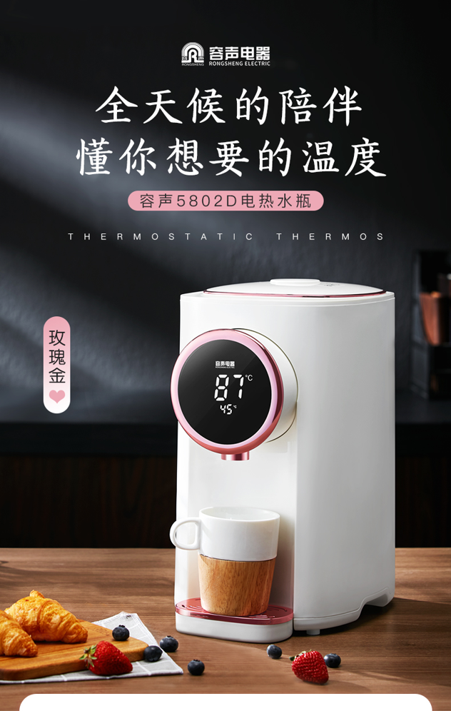 这款容声 RS-5802D 全自动智能电热水瓶,容量是4.8L,拥有一键除氯沸腾、七段温控系统、风冷降温、双温度显示、双模式煮水和童锁设计。