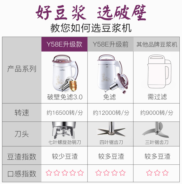 这款豆浆机,是Y58E升级款,电机输出更加强力,转数达到16500转/分钟,刀头也升级为7叶螺旋劲钢刀(由四叶锯齿研磨刀+三叶破壁刀),可以形成强大旋涡,让食材不断循环,强劲粉碎破壁释放营养,口感细腻丝滑,提升了粉碎效果。