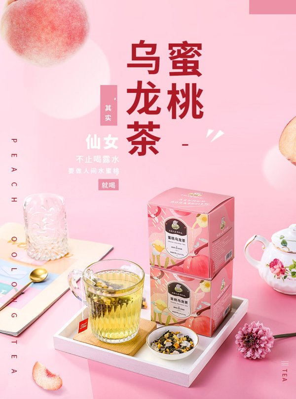 这款蜜桃乌龙茶包,是水果与乌龙的组合,原料是大颗粒蜜桃肉、苹果肉和整颗的乌龙茶叶,颗粒完整清晰,采用传统烘干工艺制成,保留了自然的果茶香,果香带甜,茶色清澈明亮,口感甘甜清润,也可以自己diy,比如加入新鲜的水果切片、蜂蜜或冰糖等。