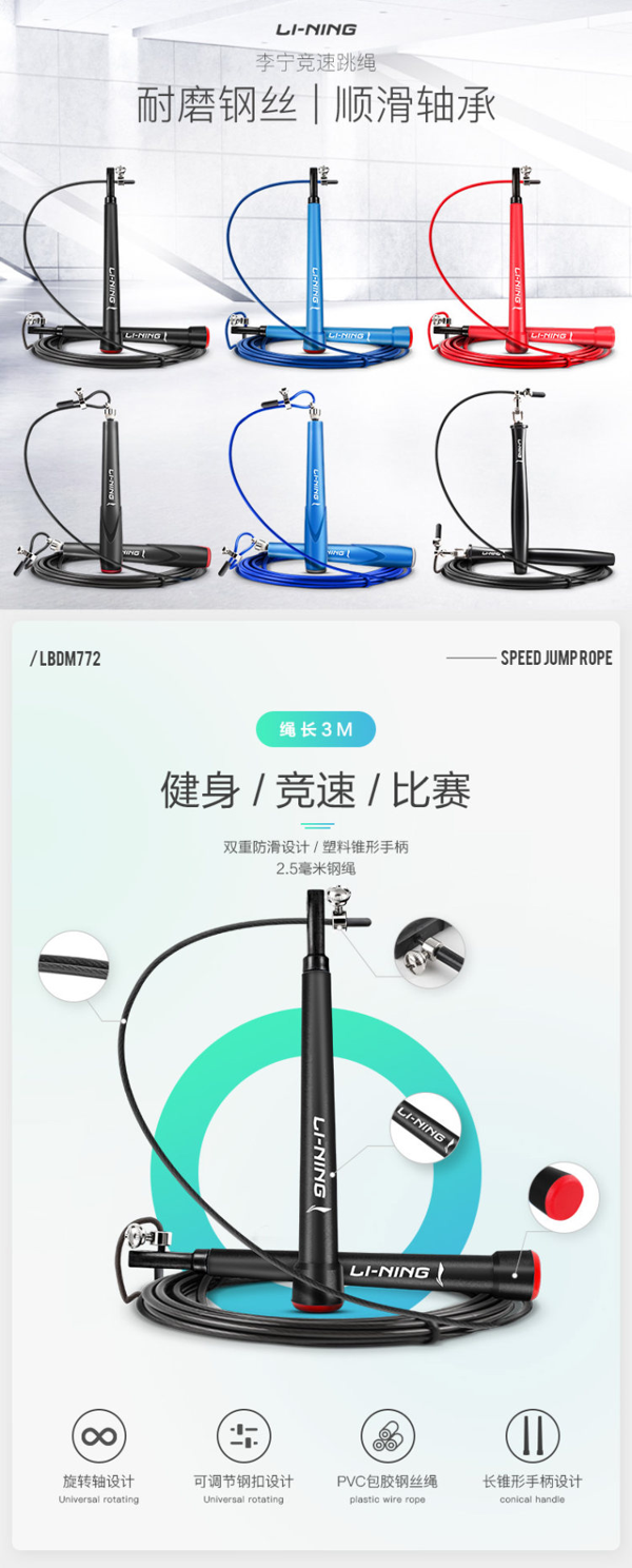 天猫锋悦运动专营店19.9元,可领5元优惠券,实付14.9元到手,是正价58元的2.6折;李宁大品牌 正品保障 防伪查询 专业防绕绳。轴承跳绳,长度3M,PVC材质,结实耐用,小巧轻便。领券链接点此