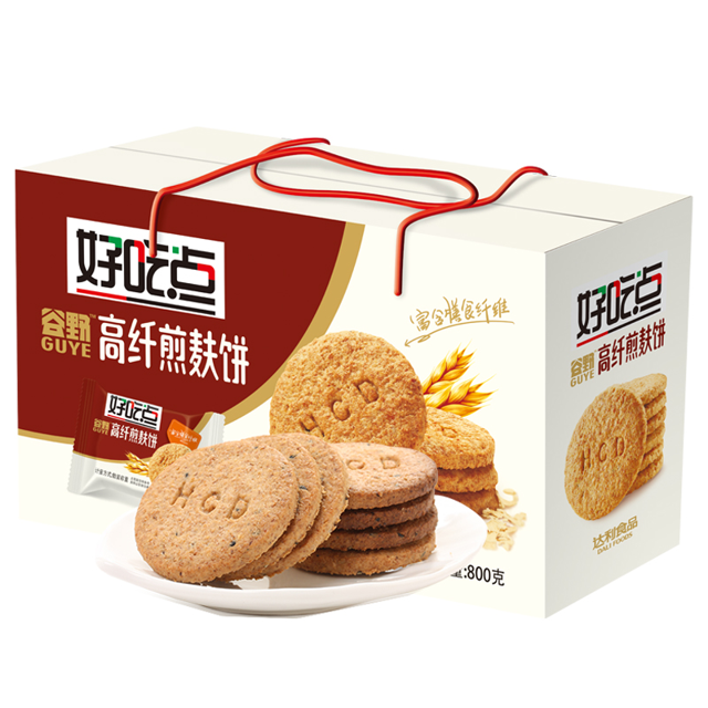 这款好吃点 高纤煎麸饼,选用小麦粉、精炼植物油、麸皮、白砂糖、鸡蛋、芝麻等原料制成,口感松软,好吃又抗饿易消化,作为早餐或者休闲小零食非常不错。规格为800g/箱。