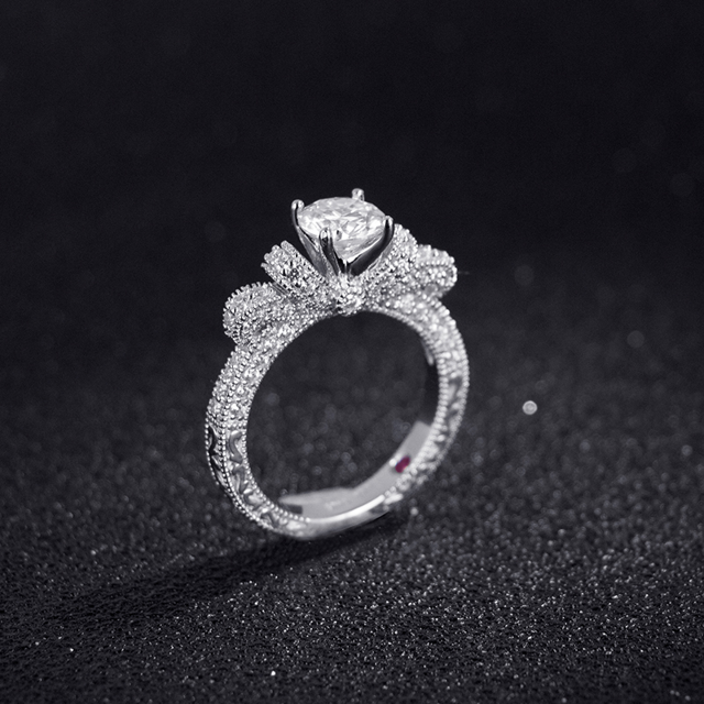 这款莫桑石戒指,戒托主体材质为925银,表面镀铑,闪耀不掉色,精选1克拉莫桑石,其折射率和光泽度是南非钻的2.5倍多,光泽明亮,火彩惊艳,蝴蝶结设计,群镶人工锆石,熠熠生辉。
