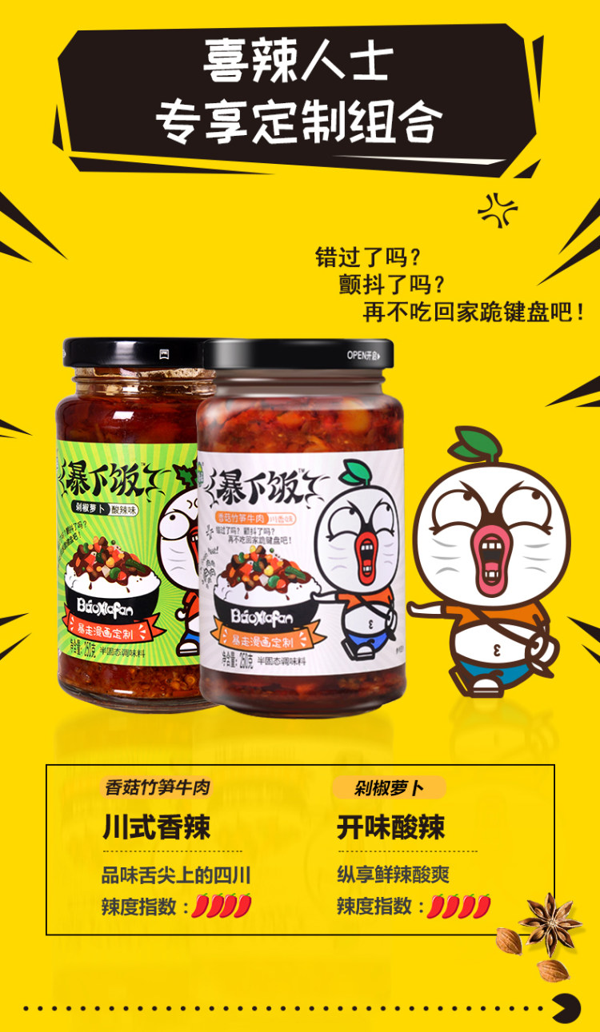 折合5.7元一瓶 ,包含:暴下饭川香250g*1+暴下饭剁椒萝卜250g*1。暴下饭量贩装,鲜辣下饭,道地原料,干香有嚼劲,口感丰富,辣而不燥,米饭好搭档。