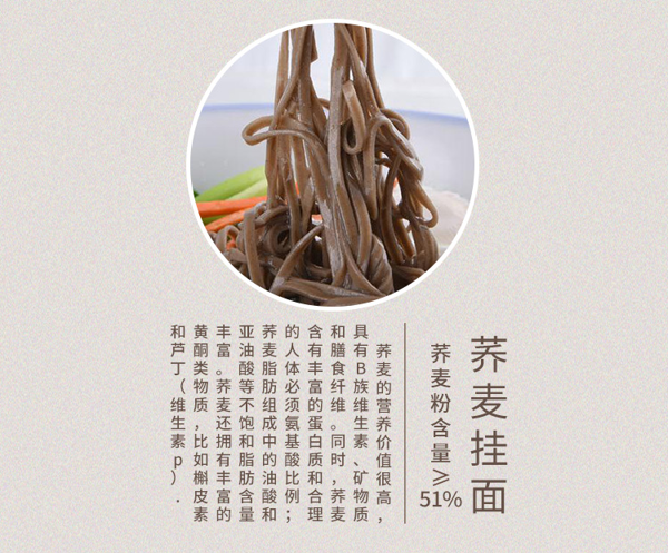 这款荞健宝 荞麦挂面,使用荞麦粉(添加量≥51%)、小麦粉、水、谷朊粉制成,不含白面粉,脂肪含量低,高饱腹低升糖,对身体更健康,无添加色素、防腐剂,适合肥胖族、高血糖患者、健身减脂的朋友。