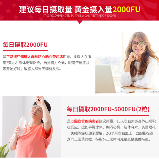日本营养健康食品协会规定,纳豆激酶的每曰正常维持量应该不低于2000FU。本品每粒胶囊提供2000FU活性纳豆激酶,在确保1粒不过量的同时,也可根据实际情况增量,给予人体充分的健康保护。注意:长期过量服用纳豆激酶可能会引起腹泻、伤口愈。